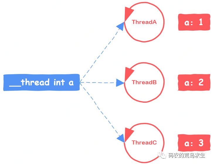 但,如果我们简单修改一下func: 复制int global_num = 100;                        int func() {                        ++global_num;                        return global_num;                        }1.2.3.4.5.6.7.                                            这时,func函数就不再是线程安全的了,对全局变量的修改必须加锁保护。 线程局部存储接下来我们再对上述func函数简单修改: 复制__thread int global_num = 100;                        int func() {                        ++global_num;                        return global_num;                        }1.2.3.4.5.6.7.                                            我们看到全局变量global_num前加了关键词__thread修饰,这时,func代码就是又是线程安全的了。 为什么呢? 其实在上一篇文章中我们讲过,被__thread关键词修饰过的变量放在了线程私有存储中,Thread Local Storage,什么意思呢? 意思是说这个变量是线程私有的全局变量: global_num是全局变量global_num是线程私有的 图片