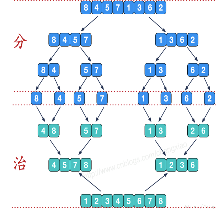 step_1: def sort(alist): gap = len(alist) // 2 #将插入排序当做增量为1的希尔排序 for i range(1,len(alist)): while i > 0 : if alist[i] < alist[i-1]: alist[i],alist[i-1] = alist[i-1],alist[i] i -= 1 else: break step_2: def sort(alist): gap = len(alist) // 2 #将增量设置成gap for i range(gap,len(alist)): while i > 0 : if alist[i] < alist[i-gap]: alist[i],alist[i-gap] = alist[i-gap],alist[i] i -= gap else: break 完整代码: #继续缩小增量 def sort(alist): gap = len(alist) // 2 while gap >= 1: #将增量设置成gap for i in range(gap,len(alist)): while i > 0 : if alist[i] < alist[i-gap]: alist[i],alist[i-gap] = alist[i-gap],alist[i] i -= gap else: break gap //= 2 return alist 五.归并排序 归并排序采用分而治之的原理: 将一个序列从中间位置分成两个序列; 在将这两个子序列按照第一步继续二分下去; 直到所有子序列的长度都为1,也就是不可以再二分截止。这时候再两两合并成一个有序序列即可。 如何合并? 下图中的倒数第三行表示为第一次合并后的数据。其中一组数据为 4 8 ,源码库 5 7。该两组数据合并方式为:每一小组数据中指定一个指针,指针指向每小组数据的第一个元素,通过指针的偏移指定数据进行有序排列。排列情况如下: 1. p1指向4,p2指向5,p1和p2指向的元素4和5进行比较,较小的数据归并到一个新的列表中。经过比较p1指向的4会被添加到新的列表中,则p1向后偏移一位,指向了8,p2不变。 2.p1和p2指向的元素8,5继续比较,则p2指向的5较小,添加到新列表中,p2向后偏移一位,指向了7。 3.p1和p2指向的元素8,7继续比较,7添加到新列表中,p2偏移指向NULL,比较结束。WordPress模板 4.最后剩下的指针指向的数据(包含该指针指向数据后面所有的数据)直接添加到新列表中即可。  def merge_sort(alist): n = len(alist) #结束递归的条件 if n <= 1: return alist #中间索引 mid = n//2 left_li = merge_sort(alist[:mid]) right_li = merge_sort(alist[mid:]) #指向左右表中第一个元素的指针 left_pointer,right_pointer = 0,0 #合并数据对应的列表:该表中存储的为排序后的数据 result = [] while left_pointer < len(left_li) and right_pointer < len(right_li): #比较最小集合中的元素,将最小元素添加到result列表中 if left_li[left_pointer] < right_li[right_pointer]: result.append(left_li[left_pointer]) left_pointer += 1 else: result.append(right_li[right_pointer]) right_pointer += 1 #当左右表的某一个表的指针偏移到末尾的时候,比较大小结束,将另一张表中的数据(有序)添加到result中 result += left_li[left_pointer:] result += right_li[right_pointer:] return result alist = [3,8,5,7,6] print(merge_sort(alist)) 六.快速排序 将列表中第一个元素设定为基准数字,赋值给mid变量,然后将整个列表中比基准小的数值放在基准的左侧,比基准到的数字放在基准右侧。然后将基准数字左右两侧的序列在根据此方法进行排放。 定义两个指针,low指向最左侧,high指向最右侧 然后对最右侧指针进行向左移动,移动法则是,如果指针指向的数值比基准小,则将指针指向的数字移动到基准数字原始的位置,否则继续移动指针。 如果最右侧指针指向的数值移动到基准位置时,开始移动最左侧指针,将其向右移动,如果该指针指向的数值大于基准则将该数值移动到最右侧指针指向的位置,然后停止移动。 如果左右侧指针重复则,将基准放入左右指针重复的位置,则基准左侧为比其小的数值,右侧为比其大的数值。 第一次排序:将将比基准小的排列在基准左侧,比基准大的排列在基准右侧 def sort(alist): low = 0 high = len(alist)-1 #基准:最左侧的数值 mid = alist[low] #low和high的关系只能是小于,当等于的时候就要填充mid了 while low < high: while low < high: if alist[high] > mid: high -= 1 else: alist[low] = alist[high] break while low < high: if alist[low] < mid: low += 1 else: alist[high] = alist[low] break #当low和high重复的时候,将mid填充 if low == high: alist[low] = mid #or alist[high] = mid break return alist 完整代码: def sort(alist,start,end): low = start high = end #递归结束的条件 if low > high: return #基准:最左侧的数值 mid = alist[low] #low和high的关系只能是小于,当等于的时候就要填充mid了 while low < high: while low < high: if alist[high] > mid: high -= 1 else: alist[low] = alist[high] break while low < high: if alist[low] < mid: low += 1 else: alist[high] = alist[low] break #当low和high重复的时候,将mid填充 if low == high: alist[low] = mid #or alist[high] = mid break #执行左侧序列 sort(alist,start,high-1) #执行右侧序列 sort(alist,low+1,end) return alist |