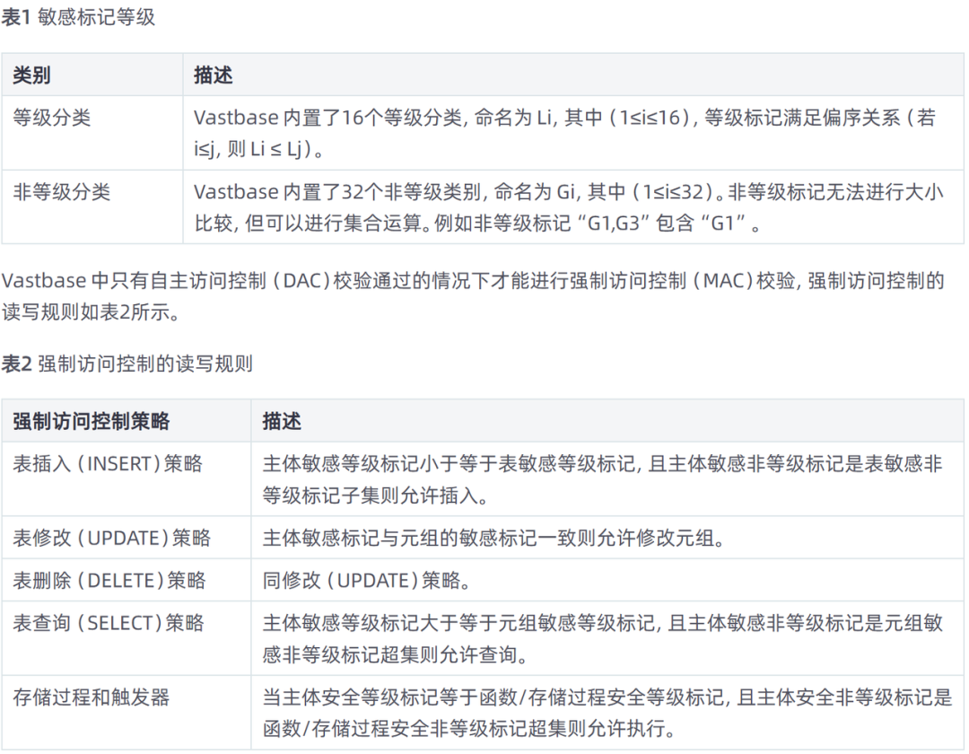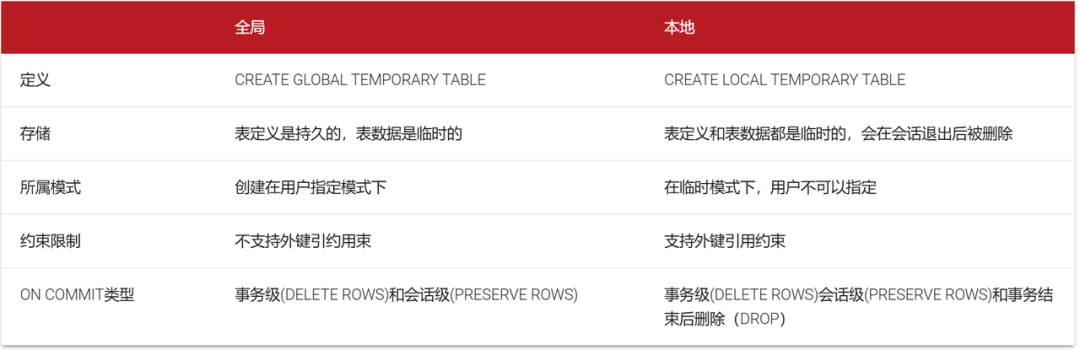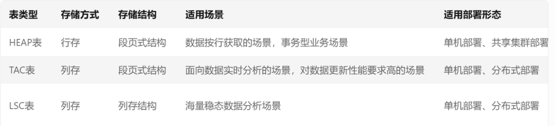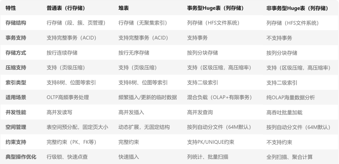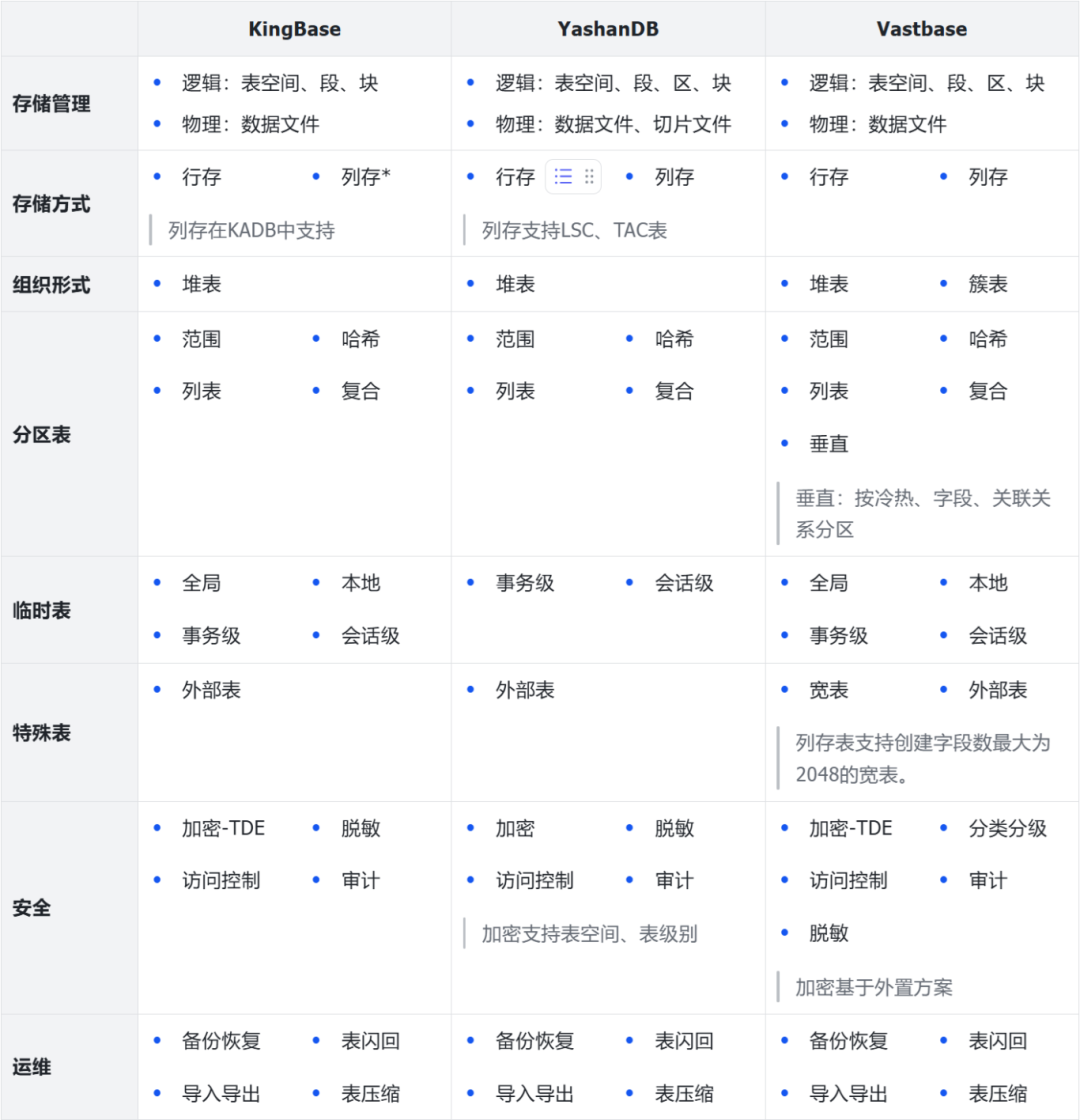 下面以达梦数据库为例,默认提供的普通表是簇表结构,同时也提供了堆表的选择。此外,针对分析需求则提供了Huge表。Huge File System(简称 HFS)是达梦数据库实现的,针对海量数据进行分析的一种高效、简单的列存储机制。列存储表(也称为 HUGE 表)就是建立在 HFS 存储机制上的一种表。  8.png 4)分区表厂商针对分区表的支持,各有不同,但都支持了典型的范围、列表、哈希及复合的数据拆分能力。此外,针对分区常见的创建、删除、截断、分裂、合并等分区操作也大多支持。 5)临时表各家产品对临时表,也都支持。以金仓数据库为例,临时表用于存放只存在于事务或会话期间的数据。临时表中的数据对会话是私有的,每个会话只能看到和修改自己的数据。您可以创建全局(GLOBAL)临时表或本地(LOCAL)临时表。 临时表对于必须临时缓存结果集的应用程序很有用。创建临时表使用CREATE TEMPORARY/TEMP TABLE语句。将 GLOBAL 或 LOCAL 写在 TEMPORARY 或 TEMP 的前面,指定全局临时表或本地临时表。创建临时表时若不指定GLOBAL或LOCAL,则默认值为LOCAL。  9.png 6)特殊表除了上面通常意义的表外,针对特殊场景,有些产品还提供特殊表类型来支持。这一功能各家产品差异较大,当用户有特殊诉求时,可寻找更为合适的产品。这里MySQL凭借了灵活的插件能力支持了非常多的特殊表类型。此外,常见的外部表也被大多数数据库所支持。 7)安全安全能力覆盖范围很广泛,这里抽取了与表有相关性的加密、脱敏、审计、防火墙、访问控制等几个来对比。以加密为例,各家产品的实现差异是比较大的。有的产品支持了灵活的加密粒度(库、表、列)、多种加密算法(AES、国密等)、甚至多级密钥管理都是支持的;有些产品则较为简单,提供加密包用户自行实现。但针对加密功能,从文档上看普遍缺少对实用性的描述,例如如何做密钥轮转、加密后性能衰减如何等,看来还是有待于进一步增强。除加密外,其他安全能力各家差异更大,如脱敏的支持等等。比较有意思的是海量的 Vastbase,还通过标签能力提供类似分类分级的功能,比较有特色。Vastbase中敏感标记由等级分类和非等级类别两部分组成,针对不同等级分类,可采取不同控制策略。  10.png 8)运维表的运维场景也很多,这里选择场景的备份恢复、导入导出、压缩、闪回等。针对上述能力,各家产品大多已支持,差异在于实现程度各有不同。例如,针对压缩功能,有的产品是可以灵活选择压缩算法,有的产品则当数据填充量达到一定阈值就自动启用压缩等。  |