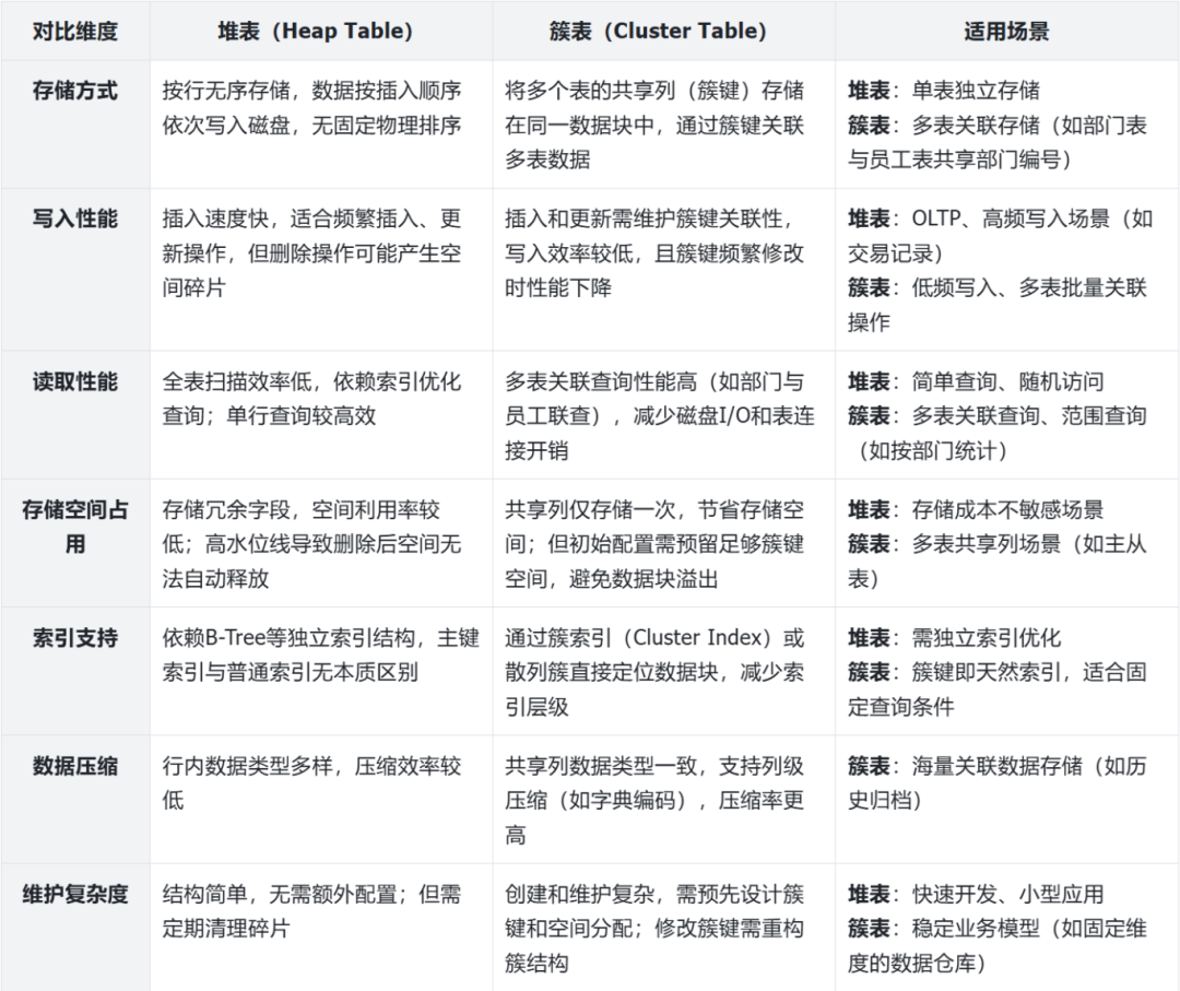 下面以 YashanDB 为例,YashanDB 支持行式和列式两种不同的数据存储格式,对应段页式和切片式两种不同格式的数据存储文件,分别为数据文件(DataFile)和切片文件(SliceFile)。针对行存与列存,也提供不同表类型与之对应。  6.png 3)组织形式在组织形式上,各家产品的策略不同,一般都提供了对堆表、簇表的支持,但不同在于默认形式不同。云服务器也有的数据库产品提供了其他的组织形式。下图简单对比下堆表与簇表的差异  7.png