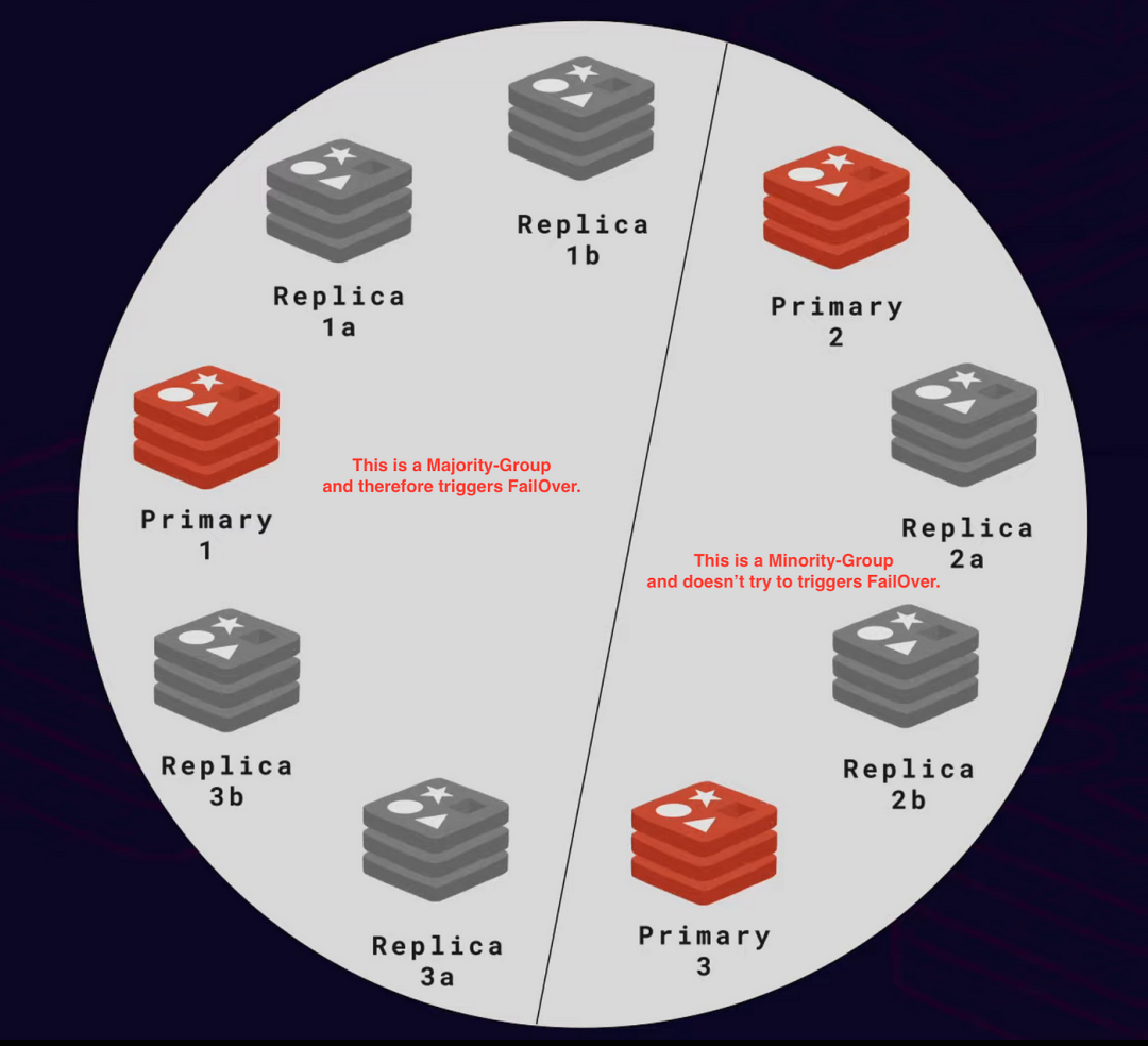在这里,左侧组(节点集合)处于少数,因此它不会尝试触发故障转移,并将停止接受任何客户端写入请求。 右侧组(节点集合)处于多数,因此它具有触发任何主分片故障转移的权限和能力。 |