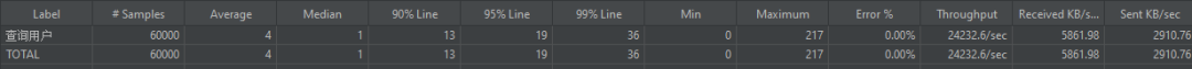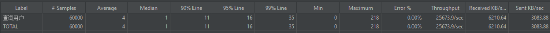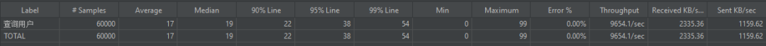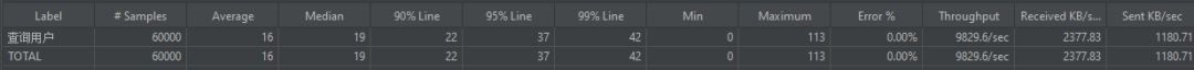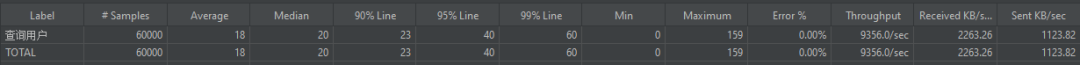 吞吐量平均:9300 该结果与不使用注解相差不大。 思考:为什么使用了@Transactional注解反而性能更高呢?欢迎大家留言讨论。 2.3 使用JDBC查询 测试1,不使用@Transactional注解 复制private final JdbcTemplate jdbcTemplate ; public User queryUser() { return this.jdbcTemplate.queryForObject("select id, name, age, phone, sex from o_user where id = 4888888", new RowMapper<User>() { @Override public User mapRow(ResultSet rs, int rowNum) throws SQLException { User user = new User() ; user.setId(rs.getInt("id")) ; user.setAge(rs.getInt("age")) ; user.setName(rs.getString("name")) ; user.setPhone(rs.getString("phone")) ; user.setSex(rs.getString("sex")) ; return user ; } }) ; }1.2.3.4.5.6.7.8.9.10.11.12.13.14.15. JMeter测试结果: 图片