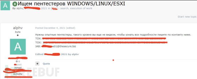 帮助信息 每种模式如下所示:  BlackCat 勒索软件BlackCat 勒索软件在 2021 年底开始频繁攻击,也是亿华云计算第一个已知的使用 Rust 编写的勒索软件。BlackCat 背后的开发者于 2021 年 12 月初首次被发现在俄罗斯地下犯罪论坛上进行宣传。 论坛信息