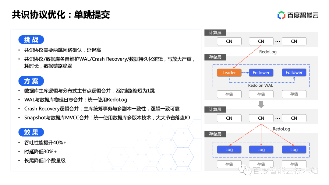 下面我们一起来看下共识模型上的改变。 像 Raft 协议是需要两跳网络才能实现一次提交确认的,右上角就是 Raft 的数据流架构:CN 节点将写发送给 Leader 后,需要等待 Leader 发送给 Follower 并至少收到一个返回后才能成功。 这里就带来了两跳网络和 I/O 的同步等待问题。而 GaiaDB 则是计算节点直接发送给多个 Log 服务并等待多数派返回,这样不依赖任何特殊硬件与网络就降低了延迟。这样系统里不管是事务的一致性还是多副本一致性,统一由计算节点统筹维护,所有的增量日志也统一为数据库物理日志,整体数据流简单可控。 对于数据风险最高的 Crash Recovery 场景,由于统一使用了数据库语义,整体流程更加健壮,数据可靠性更高,降低了数据在多种日志逻辑之间转换和同步带来的复杂度风险。而在性能方面,由于存储层自身具备回放能力,可以充分利用 LogService 层的日志缓存能力。对于写操作来说,不需要每次更改都刷盘,可以批次回放刷盘,大大节省了磁盘吞吐与 I/O。 经过以上改造,线上吞吐性能可以提升 40% 。同时由于链路简化,也大大优化了长尾延迟。像之前计算节点与分布式主节点之间发生网络抖动的场景,就会被多数派的返回特性来优化。 图片