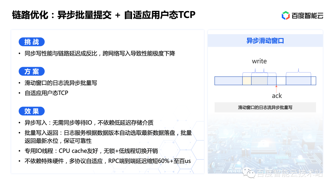分享完一致性协议层优化,接下来我们来探讨一下链路层优化。 我们知道,总吞吐与并发度成正比,与延迟成反比。一致性协议层改造并缩短了数据链路,可以通过降低延迟来增加吞吐。那么有没有办法通过提升数据流的并发度来提升吞吐呢?答案是可以。由于数据库的物理日志自带版本号与数据长度,所以不需要像通用存储一样实现块级别串行提交。之所以使用通用存储需要串行提交,是因为存储端只能根据请求到达的先后确定数据版本,如果乱序到达,最后生效的版本是不可知的。 而对于 GaiaDB 来说,由于 LogService 具备数据库语义的识别功能,所以计算节点只需要异步进行写入,日志服务就会自动根据数据版本选取最新数据,然后根据写入情况批量返回成功,这样链路就可以实现延迟与吞吐的解耦。 当然计算层依然会等待日志层批量返回的最新落盘版本后再返回事务提交成功,所以依然可以满足提交成功的事务一致性、持久化的要求。 另外针对高负载下 I/O 请求与数据库业务请求争抢 CPU 的问题,我们使用了 I/O 线程隔离技术,通过资源隔离的方式,将 I/O 线程与数据库业务线程进行隔离。这样即使在复杂负载场景下,I/O 延迟仍可以保持在较低水平。 图片