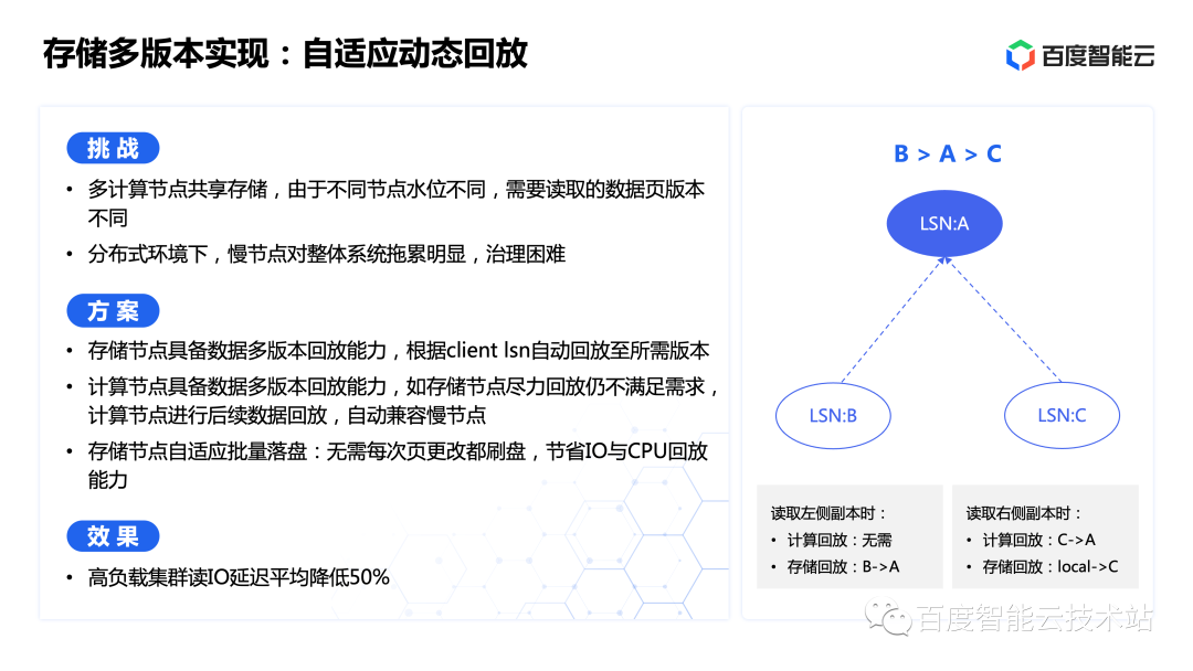 在分析完前面两部分之后,可能会有同学有疑问:既然日志层到存储层不是同步写,是不是最终系统的一致性降低了?有没有可能发生数据丢失或不一致的问题呢?答案是不会。因为 GaiaDB 的存储是一套支持 MVCC 的多版本系统。所以即使回放实现上是异步,但是由于请求方会提供所需要的数据版本,存储层可以提供对应版本的强一致数据视图。 GaiaDB 的存储节点支持数据页的回放功能,可以动态回放至任意目标版本后再返回,在之前的版本里,假如由于异步的因素还没有获取到这部分增量日志,存储节点也会启用优先拉取的策略实时拉取一次日志后再回放,以此来提供较好的时效性。而在最新的 GaiaDB 版本中,我们也在计算层添加了同样的回放能力,存储节点尽力回放后仍不满足需求的,由计算节点进行剩余任务。 这样对于存储慢节点的兼容能力就大大增强了,同时由于存储节点会尽力回放,所以也可以最大化利用存储层的算力资源。对于刷脏逻辑目前也完全下沉到了存储层,存储节点可以自主控制刷盘策略和时机,尽量合并多次写后再进行落盘,大大节省了磁盘 I/O 负载,平均 I/O 延迟降低了 50%。 图片