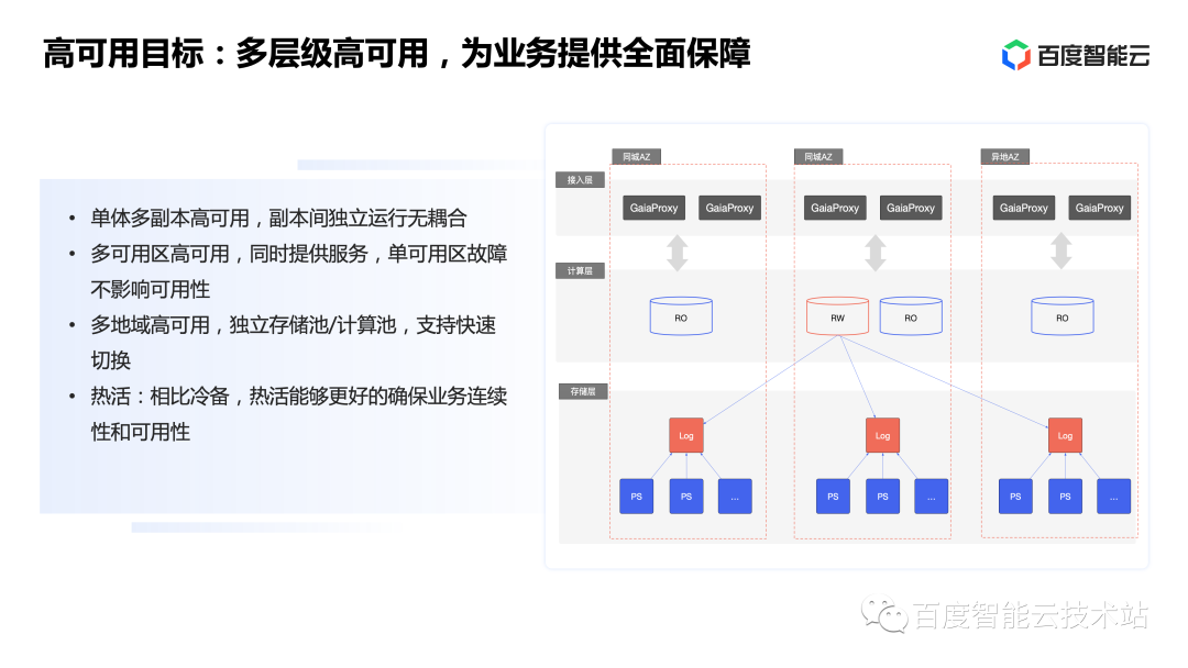 GaiaDB 是从百度智能云多年数据库研发经验积累中逐渐迭代而来。GaiaDB 于 2020 年发布首个版本,首次实现了基于存算分离的大容量存储和快速弹性能力,解决了百度内部的历史库、归档库等大容量存储需求。云服务器 紧接着,为了满足集团内大部分核心业务的跨地域热活准入门槛和就近读性能需求,GaiaDB 于 2021 年发布了地域级热活功能。跨地域热活仍然使用存储层同步的方案,同步延迟与吞吐都相较逻辑同步有很大提升,从地域可以实现与主地域接近相同的同步能力,不会成为拖慢整体系统的短板,也不会像逻辑同步那样在大事务等场景下出现延迟飙升的问题。 所以 2.0 版本上线后,GaiaDB 逐渐接入了手百、贴吧、文库等多个核心产品线,解决了业务在跨地域场景下的延迟与性能痛点。 随着业务的逐渐上云,多可用区高可用的需求慢慢凸显,如何实现单机房故障不影响服务成为了很多业务上云的关注点。为此 GaiaDB 打造了可支持跨可用区热活的 3.0 版本,每个可用区都可以实时提供服务并且不增加额外的存储成本。而在今年, GaiaDB 推出了更加智能化的 4.0 架构,性能进一步提升,功能完整度也在持续完成覆盖。 图片