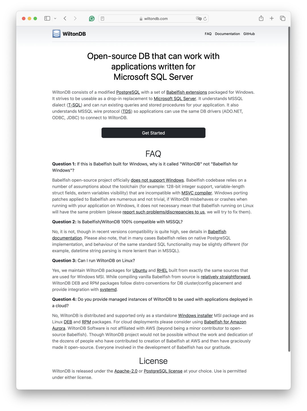 所谓线缆协议兼容,就是指客户端什么都不用改,依然访问 SQL Server 1433 端口,使用 MSSQL 的驱动与命令行工具(sqlcmd)访问加装 BabelfishPG 的集群就可以了。而且更神奇的是,你依然可以使用 PostgreSQL 的协议语言语法,从原来的 5432 端口访问,和 SQL Server 的客户端并存 —— 这就给迁移带来了极大的便利条件。 WiltonDB当然 Babelfish 并不是一个单纯的 PG 扩展插件,它对 PostgreSQL 内核进行了少量修改与适配。并通过四个扩展插件分别提供了 TSQL 语法支持,TDS 线缆协议支持,数据类型以及其他函数支持。 图片