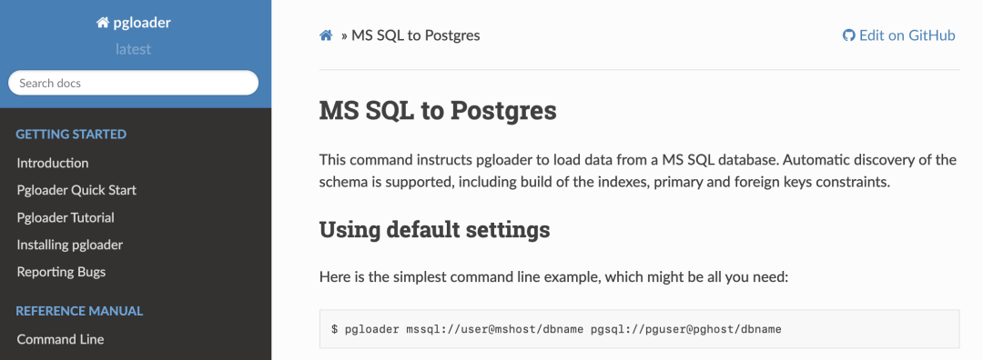 这意味着原本属于 PostgreSQL RDS 的能力 —— 高可用,时间点恢复,监控系统,IaC管控,SOP预案,甚至无数的扩展插件都可以嫁接融合到 SQL Server 版本的内核之上。 怎么迁移过去?PostgreSQL 生态除了有Babelfish这样给力的内核与扩展,还有着繁荣的工具生态。如果要想从 SQL Server 或 MySQL 迁移到 PostgreSQL ,我强烈推荐一款杀手级迁移工具:PGLOADER。 这款迁移工具傻瓜化到了离谱的程度,在理想的情况下,你只需要两个数据库的连接串,就可以完成迁移了。对,真的是一行多余的废话都没有。 图片