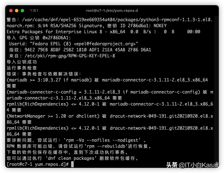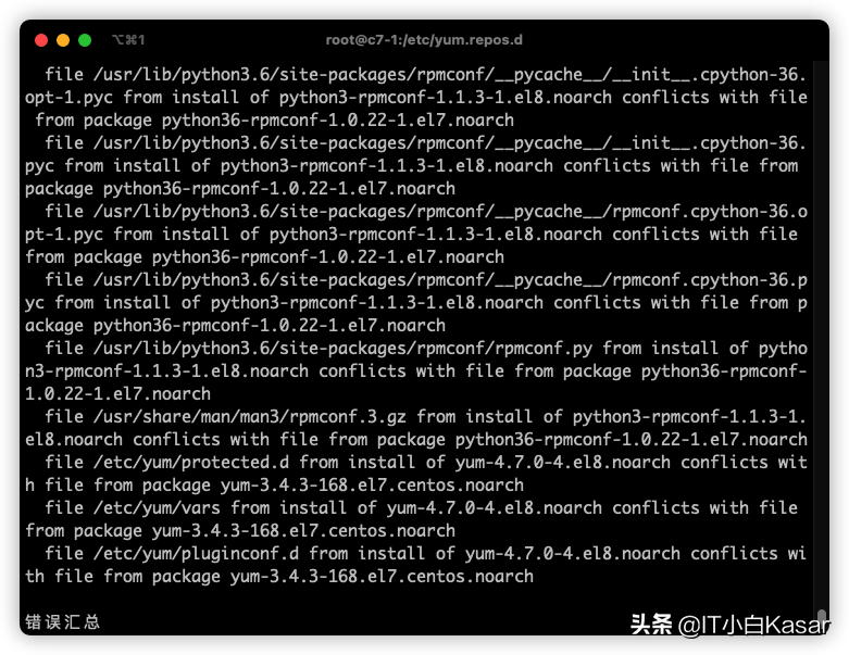 继续执行更新命令 此时会出现报错,如下图所示,主要原因为在 7 版本和 8 版本软件名称发生了变化,例如 Centos7 里的 python3-rpmconf 到了 8            会变成 python36-rpmconf