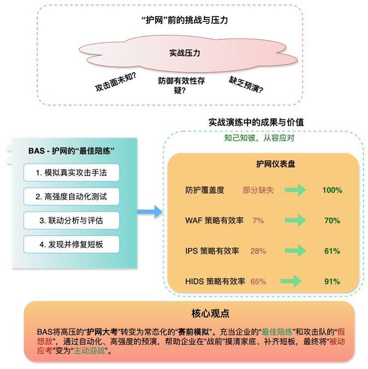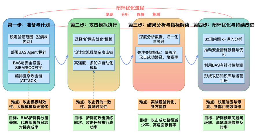 具体来说,BAS系统可自动化、高强度、多轮次地模拟红队在真实攻防演练中常用的攻击手段来验证并提升企业实战能力。例如,针对互联网暴露面资产进行漏洞利用尝试,模拟Web应用的高发威胁,执行攻防演练中的常见攻击手法。同时,BAS系统与企业安全产品深度联动,实时收集各类日志,量化关键指标,如防护覆盖度、攻击成功路径数量、高危漏洞阻断率。防护覆盖度能直观展现企业对外攻击面的收敛效果,精准定位是否存在漏防区域;攻击成功路径数量反映模拟攻击渗透到核心资产的路径条数,数字越低,防御能力越强;高危漏洞阻断率则直接衡量防御体系对攻防演练常见攻击手法的防御成功率。 BAS赋能攻防演练的“四步走”方案 图片 第一步:准备与计划为攻防演练预演设定明确的验证范围并准备全面的攻击剧本。建议企业在演练前至少一个月开始BAS验证任务,并在整个准备阶段持续验证,同时,应深入关注历年攻防演练中高频出现的攻击类型、漏洞利用手段以及红队惯用的渗透路径,以便构建更具针对性的防御体系。企业需全面确定应验证的安全产品范围,覆盖所有可能成为攻击目标的边界安全产品(如防火墙、WAF、IPS)、内网安全产品(如IDS、EDR、准入控制、堡垒机),以及核心业务系统和重要资产。 在关键节点,如互联网暴露面服务器、内网核心业务主机和高价值终端等重要区域部署BAS的Agent/探针,并确保其与BAS管理平台网络调用正常。同时,确保BAS系统能够与所有相关安全产品和SIEM/SOC平台进行日志对接,筛选出与攻防演练高频攻击、横向移动、权限提升等相关的告警、阻断、审计日志。最后,借鉴历史攻防演练经验、最新威胁情报和ATT&CK框架,选择或编排覆盖攻防演练常见攻击手段和渗透路径的复杂攻击链脚本,如利用0day漏洞渗透核心数据库。 难点与关键点: 攻击模板的时效性:攻防演练攻击手段更新迅速,要求BAS攻击库能够及时更新并保持高度真实性;大规模模拟的无害化:在生产环境中进行高强度模拟时,要严格控制,避免对业务造成影响。 具体目标: 确保模拟覆盖所有历年攻防演练得分或高频攻击手段;所有关键演练区域的代理部署完成,且日志对接成功。第二步:模拟攻击的设计编排和执行通过自动化方式执行攻防演练场景下的真实对抗行为。企业应利用BAS产品的攻击编排能力,设计编排涵盖攻防演练全流程的复杂攻击链攻击,例如模拟攻防演练高频Web漏洞利用、常见服务弱口令爆破、内网横向移动获取数据的完整攻击链。在执行过程中,应确保BAS系统攻击流量高度仿真,模拟行为设计精巧,既能有效触发安全产品响应,又能避免对生产业务造成影响。 攻击频率建议在攻防演练前1-2个月,设定每周2-3次高强度、多轮次自动化模拟,以进行充分的预热和问题发现;临近攻防演练时,可增加到每天1-2次的快速验证,确保关键修复及时生效。 难点与关键点: 精确模拟攻击者的行为,使其能够有效绕过或隐藏自身,从而突破安全产品的检测;复测的及时性至关重要,每次修复后,必须立即通过BAS进行复测,以验证修复效果。 具体目标: 完成多轮BAS模拟攻击演练;保证模拟攻击的真实性,确保BAS系统能够成功执行所有模拟攻击任务第三步:结果分析与指标解读BAS系统自动化完成日志的归一化和关联,并生成详细的攻防演练前沿预演报告。企业应深度分析这些数据,并将其转化为可操作的洞察,以指导防御体系的精准优化。应重点关注以下量化指标: 防护覆盖度:反映企业安全防护对网络资产、业务系统和互联网暴露面的实际覆盖程度,能够精准定位和消除“漏防”区域。例如,通过BAS验证,防护覆盖度可从部分路径提升至100%;攻击成功路径数量:反映模拟攻击渗透到核心资产的路径条数,该数字越低,防御能力越强,表明防御体系对实战攻击的有效阻断能力;高危漏洞利用阻断率:直接衡量防御体系对攻防演练常见攻击手法的防御成功率。企业可依据自身业务特性和合规要求设定“及格分数”。例如,防护覆盖度目标达100%,攻击成功路径数量趋近于零,高危漏洞利用阻断率目标在95%以上。重点关注BAS模拟报告中“异常”或“未生效”的攻击路径,深入分析安全产品未能识别或阻止的原因,检查告警内容与攻击的匹配度,以及日志上报的时效性。 难点与关键点: 将实战经验有效地转化为BAS攻击库,确保其攻击模板的真实性和有效性;多方协作至关重要,攻防演练准备涉及多个部门,安全部门需与IT运维、业务等多方高效协作,共同推动问题解决。 具体目标: 对比之前的模拟结果,显著减少攻击成功路径数量;将BAS发现的互联网高危风险在攻防演练前修复并复测通过。第四步:闭环优化与持续改进发现问题不等于提升安全水平,将短板转化为改进措施并验证效果,才是BAS发挥核心价值、实现防御体系螺旋式上升的关键。BAS的闭环管理是一个“模拟攻击-发现分析-修复优化-再次验证”的迭代过程。 应由专人团队负责深入分析BAS指出的防护缺陷,例如某WAF规则被绕过,或某EDR策略未生效等,并定位问题根源,判断是策略配置、软件版本,还是安全能力缺失所致。接下来,与IT运维等相关部门协同,依据报告修复建议,实施安全措施,如优化WAF规则、升级补丁、加固网络隔离等。修复后,应利用BAS系统针对性“复测”,验证优化效果,并将优化后验证场景常态化运行,持续监控指标变化,发现新风