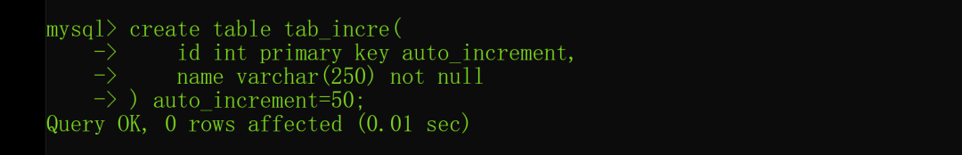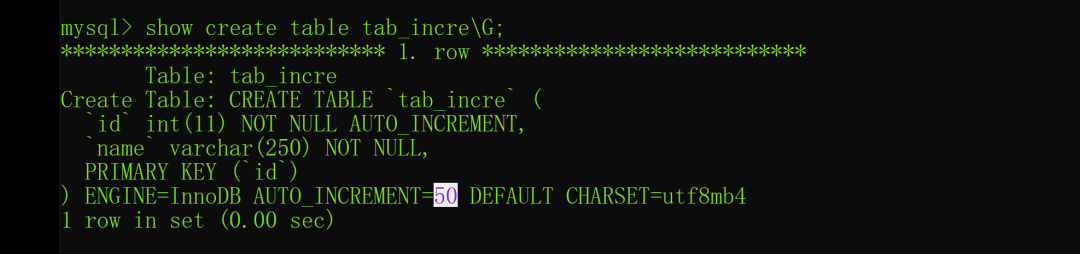 此表的自增值为 50,我们也可以创建一条数据来验证一下自增值是否为 50,如下图所示: