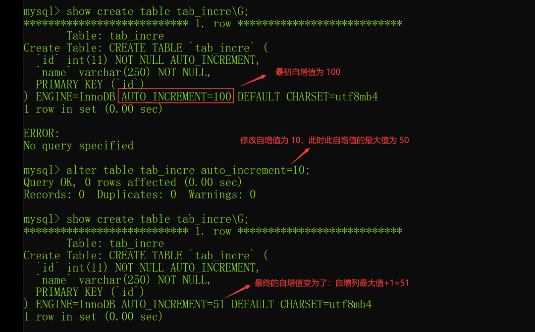 2、云服务器手动修改自增值当表创建之后,我们也可以通过 alter 命令来修改自增列的值,它的修改命令如下: 复制alter table table_name auto_increment=n;1.                                                                如果要将 tab_incre 表中的自增值修改为 100,可使用以下 SQL 来实现:   注意事项当我们试图将自增值设置为比自增列中的最大值还要小的值的时候,自增值会自动变为自增列的最大值 +1 的值,如下图所示: