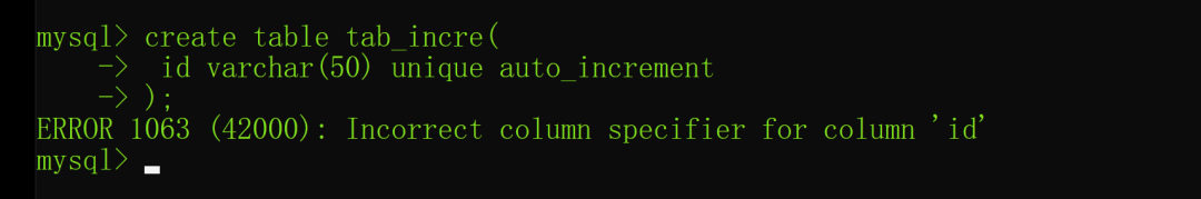 当我们使用其他类型来作为自增列的数据类型时,会提示如下错误: