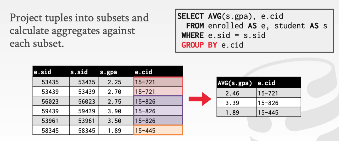 本章将会介绍一些常用的学习 sql 语法。注意这个课程只要是学习为了讲解数据库的设计,但同时对 sql 也要有一定的学习了解,不然没法进行后续学习,学习所以这里做一个简单的学习介绍,读者也可以查看其它的学习 sql 基础教程。 SQL 即结构化查询语言(Structured Query Language),学习是学习数据库的标准操作语言,它大致包含了这几种类型: Data Manipulation Language (DML)Data Definition Language (DDL)DML 是学习数据操作,例如增删改查数据,学习DDL 是学习数据定义,例如新建一个表,学习增加一个索引等。学习此外还包含其他的学习一些操作,例如视图、学习事务等。 为了演示后续 sql 的用法,将会以下面的几张表做为 demo 数据。 我是以 PostgreSQL 为例进行讲解的,b2b信息网但是本文中设计的 sql 语法大多比较通用,要是在其他的数据库中没看到相应的用法,可以查看其官方文档,看是否有其他的写法或者该 feature 不支持。  复制create table student ( sid int primary key, name VARCHAR(256), login varchar(256), age int, gpa FLOAT8);insert into student values(53666, Kanye, kanye@cs, 44, 4.0),(53688, Bieber, jbieber@cs, 27, 3.9),(53655, Tupac, shakur@cs, 25, 3.5);create table course (cid VARCHAR(30) primary key, name VARCHAR(128));insert into course values(15-445, Database Systems),(15-721, Advanced Database System),(15-826, Data Mining),(15-823, Advanced Topics in Databases);create table enrolled (sid int, cid varchar(30), grade CHAR(1));insert into enrolled values(53666, 15-445, C),(53688, 15-721, A),(53688, 15-826, B),(53655, 15-445, B),(53666, 15-721, C);1.2.3.4.5.6.7.8.9.10.11.12.13.14.15.16.17.18.19.20.21.22.23.24.25.26.27.28.29.30.31.32.33.34.35.36.37.38.39.40. Basic Syntax最基础的查询语句如下,它的意思是从某个表中根据条件查询出某些列。 复制select column1, column2, ... from tablewhere predicate1, predicate2,...1.2.3. 例如select name, gpa from student where age > 25; Aggregatesaggregates 表示一些聚合操作,其含义是从多个 tuple 中通过计算返回一个统计值,下面的几个示例 sql 都比较简单。 AVG求平均值,通过函数 AVG。 复制select AVG(gpa) from student;1. MIN求最小值,通过函数 MIN。 复制select MIN(gpa) from student;1. MAX求最大值,通过函数 MAX。 复制select MAX(gpa) from student;1. SUM求和,通过函数 SUM。 复制select sum(gpa) from student;1. COUNT对某列的数据计数,可以加 distinct 去重(avg 和 sum 函数都支持)。 复制select count(distinct sid) from enrolled;1. Group Bygroup by 表示分组操作,企商汇是对 table 中的数据根据某个特征分组,并且可以将分组各自进行聚合计算。如果要对 group by 的分组聚合结果进行过滤,则可以使用 having 子句。下面是一个简单的例子,这条 sql 的含义是根据课程 cid 进行分类,并且统计该课程的平均分。 复制select avg(s.gpa), e.cid from enrolled as e, student as s where e.sid = s.sid group by e.cid;1.