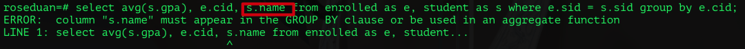 对于 group by 的场景,需要注意几点,一是 select 的列必须包含在 group by 子句中或者是聚合的列,例如我在前面的 sql 中加入一个 s.name 列,报错信息如下: