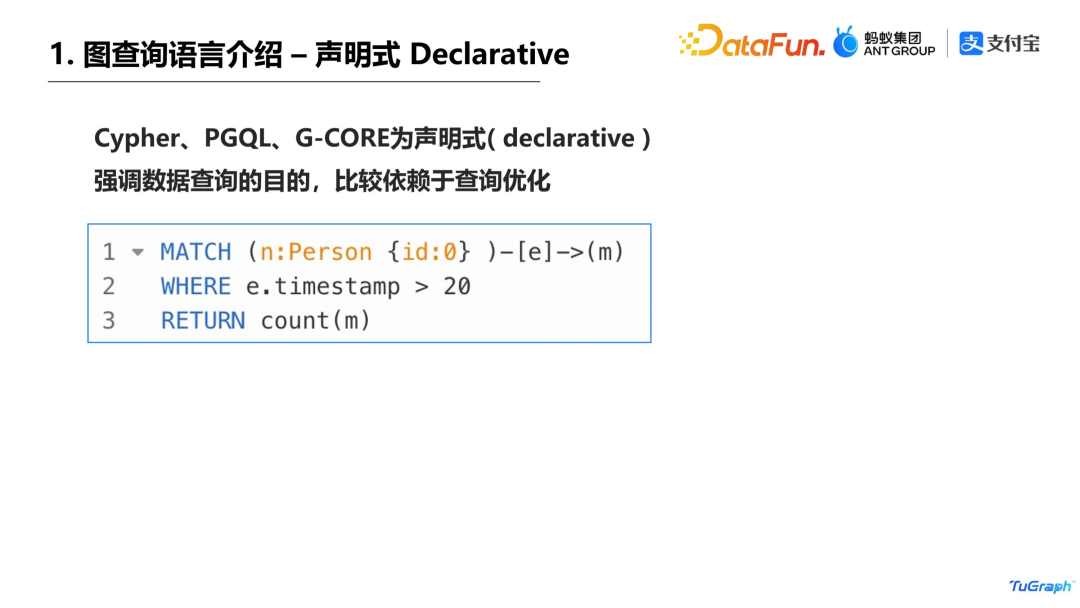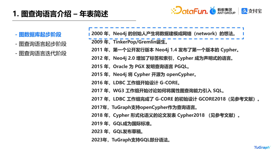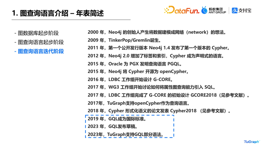 第三阶段就是我们现在正在经历的图查询语言迭代阶段。2019 年开始,GQL 成为了国际标准,开始致力于统一不同图查询语言的标准。到了 2023 年,TuGraph 也开始逐步实现 GQL。