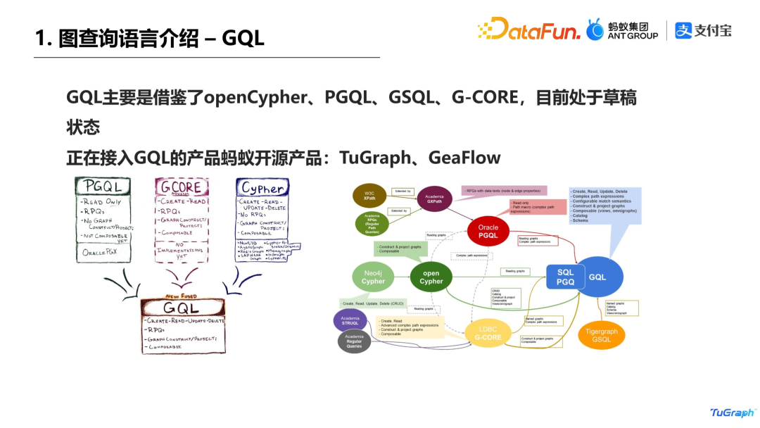 再来讲一下前面提到的国际标准 GQL。GQL 在设计上参考了 openCypher、PGQL、GSQL 和 G-CORE,但其核心思想基本上都来自于 openCypher 语言,所以它是一个声明式语言。蚂蚁内部,TuGraph 和 GeaFlow 两个产品都有接入 GQL。长期来看,GQL将会统一声明式查询语言。十年后,就像关系型数据库只有 SQL 语言一样,图数据库声明式语言中也会只剩下 GQL 这一种语言。