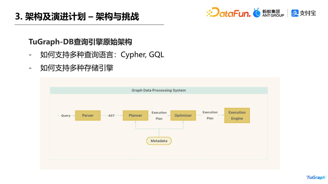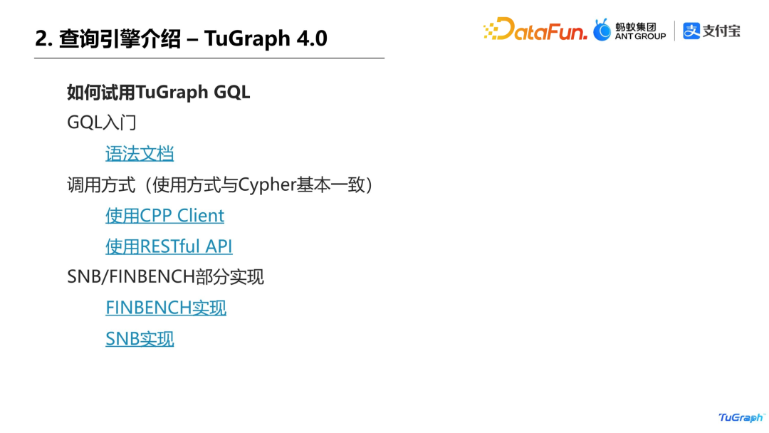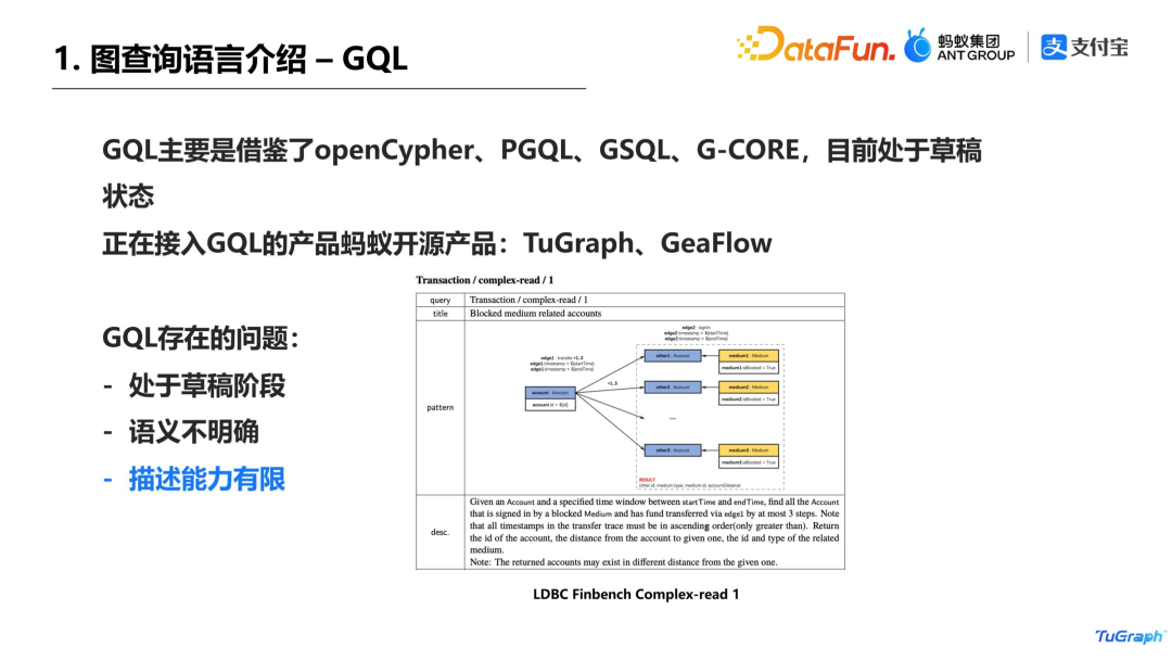 现阶段,GQL 还有很多问题,语义方面还没有讨论得非常明确,描述能力也比较有限。比如 FINBENCH,就是看查询语言或者图数据库有哪些瓶颈。上图中展示了 FINBENCH 里面的 complex-read1,金融场景里面查资金流向是比较常见的,比如从一个起点查一个账户,访问出度1-3度的边,就是一个不定跳的过程,如果是资金交易,会有时间要求,比如这笔转账流水是一个时间递增的序列,现在的声明式语言还不能很清晰地描述这种不定跳加时间递增的情况。 考虑到 GQL 将会在图数据库领域实现标准化,蚂蚁现在对 GQL 支持的力度是很大的,除了 TuGraph、GeaFlow 能支持 GQL,其它一些还没有开源的产品基本上也以 GQL 为方向去做接入。 二、查询引擎介绍接下来介绍 TuGraph 4.0 图查询引擎。