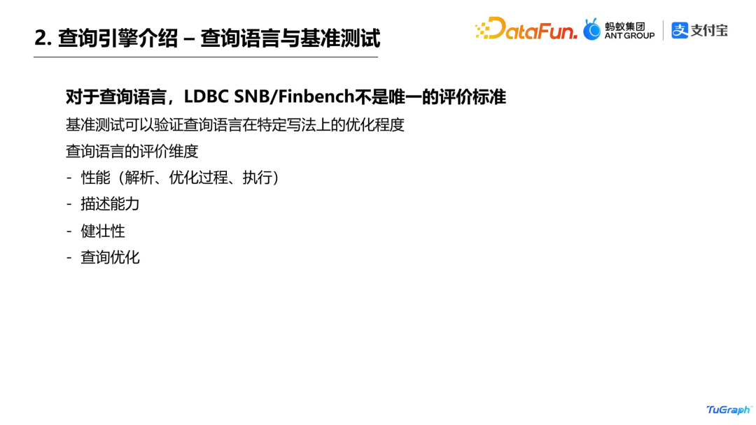 提到 SNB 和 FINBENCH,基准测试对于数据库或者查询引擎来说都是非常重要的,但并不是衡量一个查询语言的唯一标准。查询语言的评价维度包括性能、描述能力、健壮性和查询优化等等。
