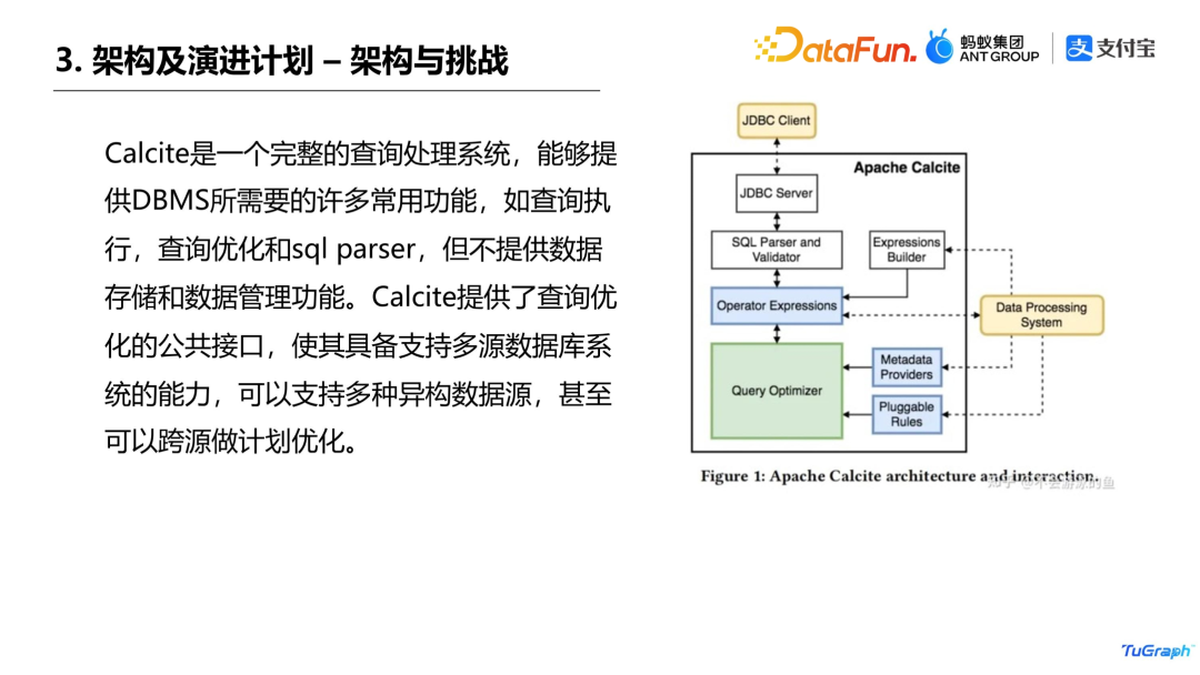 关系型数据库和图数据库的层次是比较接近的,因此我们参考了 Calcite 系统。Calcite 是一个完整的查询处理系统,能够提供 DBMS 所需要的许多常用功能,甚至可以接近一个图数据库系统,支持完整的查询语言的优化、解析、验证。我们参考它的架构去做一个类似的处理系统,实现更丰富的算子,在图的优化上能做得更多。