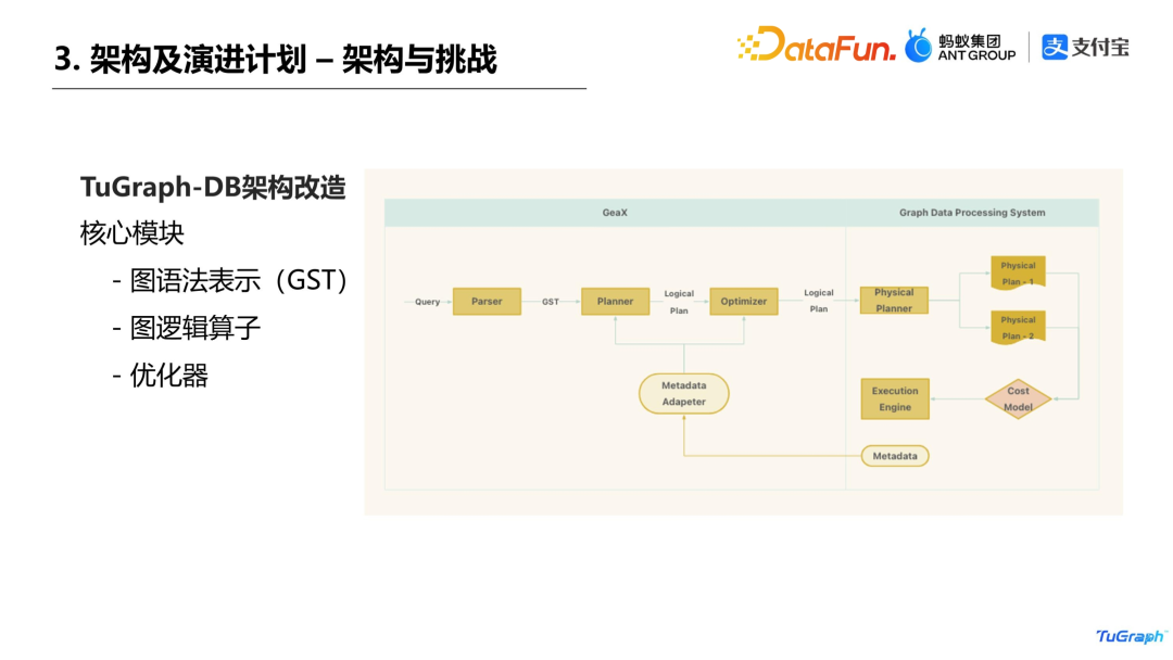 参考这个架构,我们会做 TuGraph 下一个版本的查询引擎的改造,这个改造是在整个执行引擎之上的一层改造。参见上图,右边是 Data Processing System,和 Calcite 的设计类似。左边 GeaX 中有几个核心的模块,第一个就是图语法表示(GST),Quary 解析完之后,这里加了一层抽象,这层抽象能够保证同时支持两个相似的语言,比如 Cypher 和 GQL。同时有一套独立的逻辑算子,能够描述整个查询,有单独的优化器,这里的优化器也支持可插拔的功能。这样整个系统就分为了两部分,前面的查询语言的处理,以及后面的计算和存储。