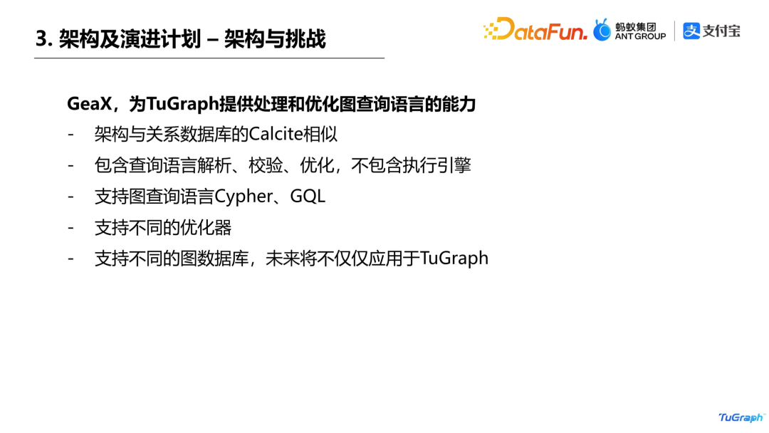 GeaX 为 TuGraph 提供处理和优化图查询语言的能力,其特点包括,架构与 Calcite 相似,支持查询语言解析、校验、优化。严格意义上 GeaX 不算是一个图计算引擎,因为它把计算的部分全部剥离了,最终产出的是一个逻辑执行计划。另外,GeaX 支持多语言,支持不同的优化器,这些优化器是可插拔的,不同类型的优化器有不同的规则。GeaX 的目标不仅仅是作为一层查询语言接在 TuGraph 上,还能够实现轻松地将 GQL 查询语言接到任何一个图相关的引擎上,比如一个人一个月就能够为 GraphScope 提供 GQL 的能力,这样也为 GQL 成为统一的图声明式查询语言提供帮助。