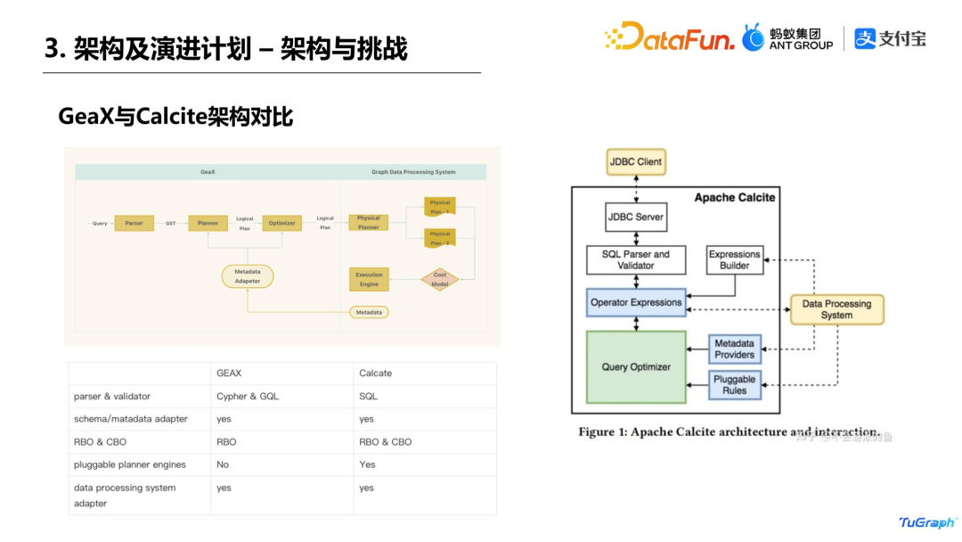通过上图的对比可以看出,GeaX 和 Calcite 在框架设计上是比较接近的,当然具体优化器的能力会有不同,这也正是 GeaX 框架的优势之一,可以放不同的优化器在这里。
