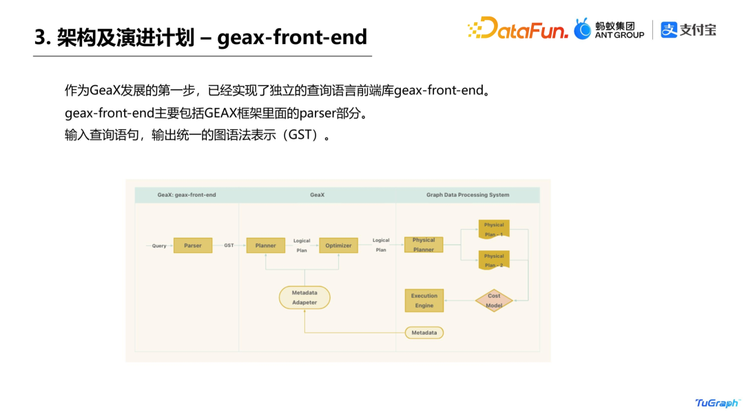 这个架构是我们未来 3-6 个月要去做的事情,现在已经迈出了第一步,实现了 geax-front-end。目前 parser 这一层已经实现。大概在 3-6 个月左右会有一版迭代,可能会有 GeaX 的出现。我们希望能做一个很简单的 play ground 给用户用,用户能在对 TuGraph 没有很多了解的情况下,尝试去看 GQL 的查询语言生成的逻辑执行计划是什么样的,通过看逻辑执行计划,判断这个查询是不是复杂,是不是可以去增加一些优化规则。 |