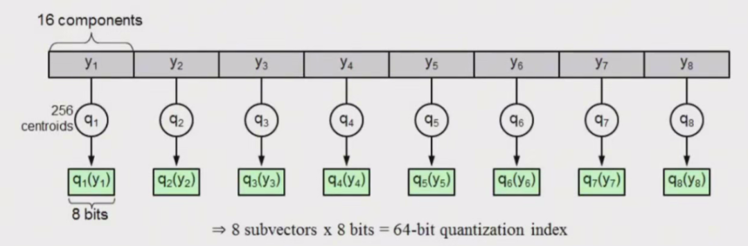 K-means++K-means++ 是一种改进的 K-means 算法,主要针对初始质心选择的问题。 K-means++的优势在于能够选择更好的初始质心,从而提高算法的收敛速度,降低陷入局部最优解的风险。 初始质心选取的基本思路就是,初始的聚类中心之间的相互距离要尽可能的远。 算法描述如下:1、随机选取一个样本作为第一个聚类中心c1;2、计算每个样本与当前已有类聚中心最短距离(即与最近一个聚类中心的距离),用 D(x)表示;这个值越大,表示被选取作为聚类中心的概率较大;最后,用轮盘法选出下一个聚类中心;3、重复2,直到选出k个聚类中心。4、使用选定的初始质心运行K-means 算法。 Kernel K-meansKernel K-means 是一种基于核方法的K-means 算法,可以处理非线性可分的数据。核方法通过将数据映射到高维特征空间,使得原本在低维空间中不可分的教据在高维空间中变得线性可分, Kernel K-means 的主要步骤如下:1.选择合适的核函数(如 RBF 核、多项式核等)和参数。2.将数据集映射到高维特征空间。3.在高维特征空间中执行 K-means 算法。4.将聚类结果投影回原始数据空间。 Kernel K-means 可以处理复杂的数据结构,但计算复杂度相对较高,可能不适合大规模数据集。在实际应用中,可以根据问题的特点选择合适的K-means 算法变体。 应用场景K-means算法广泛应用于各个领域,如:1.图像分割:将图像中的像素聚类为K个簇,可以实现图像分割和简化。2.文档聚类:将文档按照内容相似度进行聚类,有助于文档分类、信息检索和推荐系统。3.客户细分:将客户按照购买行为、兴趣爱好等特征进行聚类,有助于企业针对不同群体制定个性化的营销策略。4.异常检测:通过聚类,可以发现数据中的离群点或异常点,进而进行异常检测或数据清洗。5.降维:K-means算法可以与主成分分析(PCA)等降维技术结合,实现数据降维和可视化。 3、近似邻近(ANN)除了暴力搜索能完美的搜索出最相邻,所有的搜索算法只能在速度和质量还有内存上做一个权衡,这些算法也被称为近似最相邻(Approximate Nearest Neighbor)。 (1)Product Quantization(PQ)乘积量化在大规模数据集中,聚类算法最大的问题在于内存占用太大。 这主要体现在两个方面, 首先因为需要保存每个向量的坐标,而每个坐标都是一个 浮点数 ,占用的内存就已经非常大了。除此之外,还需要维护聚类中心和每个向量的聚类中心索引,这也会占用大量的内存。对于第一个问题,可以通过量化(Quantization)的方式解决,也就是常见的有损压缩。 假设图片检索库有1000万张图片,每张图片提取多个128维的特征向量,把这128维向量分成8个短向量,每个短向量是16维,也就是说检索库总共包含1000万x8这么多个16维的短向量。 如果当做2维矩阵的话就是1000万行x8列,每一列就是1000万个的短向量,每一列就是由每个原始128维向量对应16维子向量组成。 图片