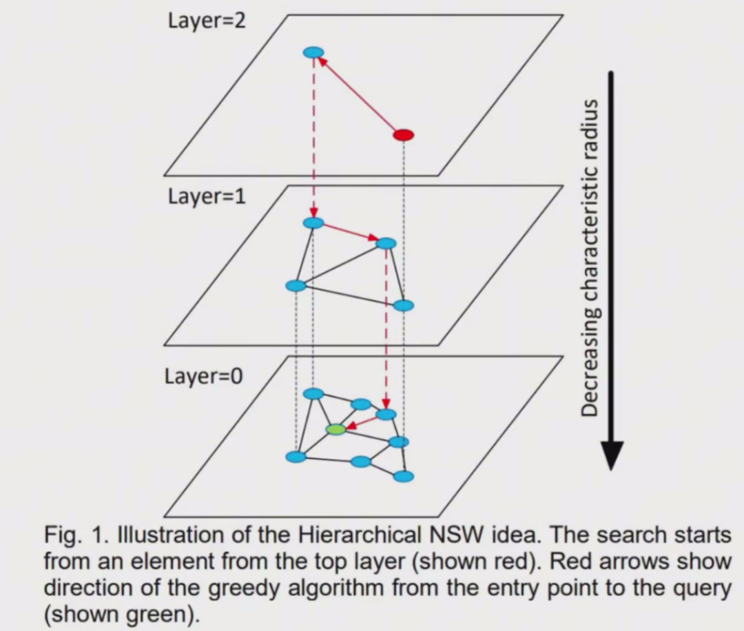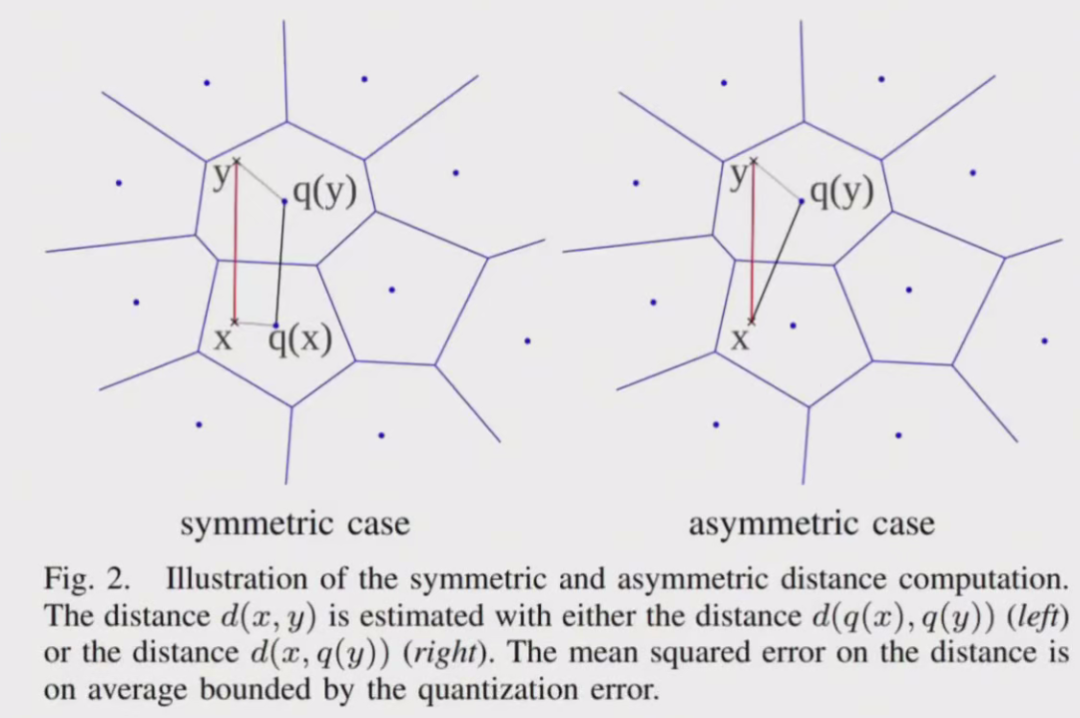 把每一列的子向量都用 k-means 聚类为 256 类,每一个短向是我们都找到他属于一堆短向量的256类中的哪一类。这样每一行的8个短向量,都会对应于各自列的256类中的一个(一共有8个独立的256类),用0-255表示(也叫码字)。 从存储上来说是 8/16xsizeof(type),type是如 foat32,float16等等,比如原来16个foat16的向量,变成了一个8bt的值,也就是1/32(保存有256个类的中心数据,不过对比1000万个数据来说已经很小啦)。 现在128维向量,由8个8bit的数字组成。 图片 距离计算查询x的时候,也需要把x先PQ量化 对称距离计算:直接使用两个压缩向量x,y的索引值所对应的码字q(x),q(y)之间的距离代替之,而q(x),q(y)之间的距离可以离线计算,相当于计算两个子类中心的距离可以把q(x),q(y)之间的距离制作成查找表,只要按照压缩向量的索引值进行对应的查找就可以了,所以速度非常快,每k=256个类别对应256x256个距离,一共只需要8x256x256个距离。 非对称距离计算:使用x,q(y)之间的距离代替x,y之间的距离,其中x是查询向量。虽然y的个数可能有上百万个,但是q(y)的个数只有k=256个,对于每个x,我们只需要在输入x之后先计算一遍x和k个q(y)的距离,相当于计算 x和每个子类中心的距离。 图片 (2)分层小世界导航(HNSW)除了聚类以外,也可以通过构建树或者构建图的方式来实现近似最近邻搜索。 这种方法的基本思想是每次将向量加到数据库中的时候,就先找到与它最相邻的向量,然后将它们连接起来,这样就构成了一个图。 当需要搜索的时候,就可以从图中的某个节点开始,不断的进行最相邻搜索和最短路径计算,直到找到最相似的向量。 图片