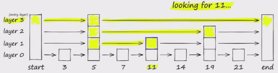 使用类似跳表算法,如下图要搜索跳表,从最高层开始,沿着具有最长“跳过”的边向右移动。 如果发现当前节点的值大于要搜索的值,表示超过了目标,因此我们会在下一级中向前一个节点。 图片