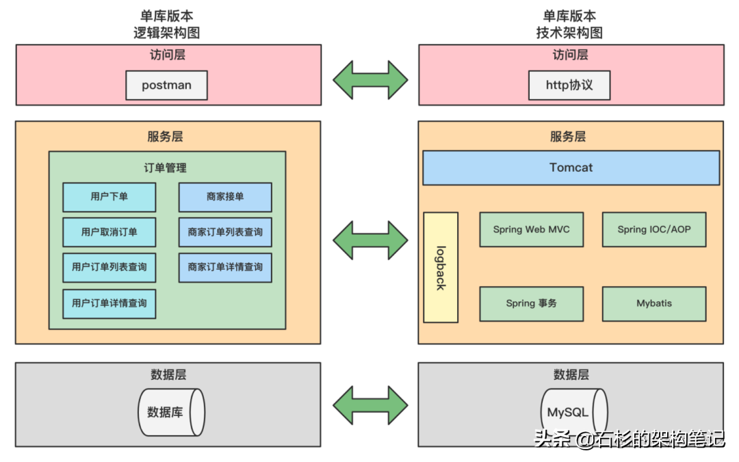 上图是单库版本订单系统的逻辑架构图和技术架构图的一个对比。该订单系统共分三层,分别是访问层、服务层和数据层。 1. 访问层: 是调用后台服务的入口,这里直接使用postman来调用,因为重点是分库分表的方案落地,偏后端,免费源码下载所以直接使用postman来作为请求入口,非常的方便。 2. 服务层: 是整个订单系统的核心,它提供了外卖订单系统的核心功能,比如用户下单、用户查询订单列表、商家接单等核心功能;而为了实现这些功能,使用了一些技术,比如使用Tomcat作为服务器来对外提供服务、使用Spring Web MVC作为web的开发框架、使用Spring IOC来管理bean、使用MyBatis来操作数据库、使用logback来记录日志。 3. 数据层: 主要是用来存储外卖订单数据,这里使用的数据库是MySQL。 业务快速增长,驱动系统架构不断演进这里设定一个背景,该外卖订单系统是位于一家初创型互联网公司的,目前积累的用户差不多10万的样子,每天活跃的用户大概就2万,b2b供应网每天相应的订单量也是2万的样子。