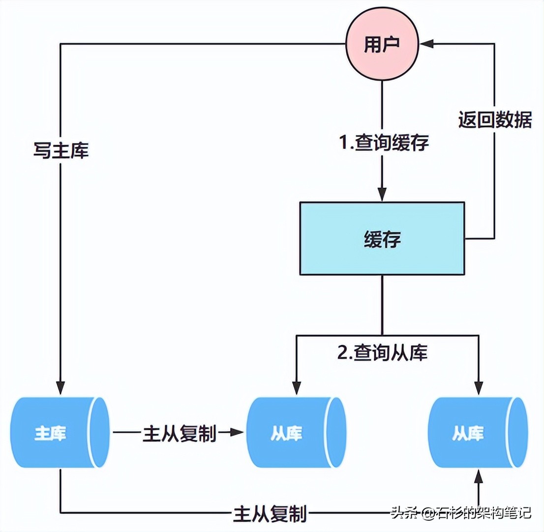 说白了,就是使用缓存来承接大多数的查询请求,这样到达数据库的请求就非常少了,数据库的资源占用率就会稳定在一个正常范围,从而使得订单sql的查询效率,不至于受到很大影响。 引入读写分离方案优化案例 —— 由于促销活动的原因,大量下单的用户会不断刷新页面来查询订单信息,比如看一下订单是否开始配送,此时就会导致大量的请求打到MySQL上去。 此时单库又抗不了这么读请求,就导致了数据库负载很高,从而严重降低了订单sql的查询效率,最终导致在促销活动期间,订单sql的查询时间突增到2.5s。 促销活动期间对订单的操作,是典型的读多写少场景,为了解决这个问题,引入了读写分离的方案,如下图:
