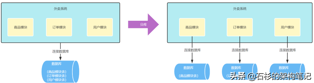 也就是写数据请求走主库,而读数据请求走从库,由于搞了2个从库,它们可以一起来抗住大量的读请求,订单sql的查询效率就可以得到显著的提升。 引入垂直分库方案引入读写分离方案后可能又会遇到一个问题,那就是此时商品模块、订单模块、用户模块都部署在同一台物理数据库上,也就是主库上,此时这台物理数据库的CPU、内存和网络的负载能力,都是商品模块、订单模块、用户模块共用的。 如某天,商品模块做了一些活动,此时商品模块就会承接大量的读请求,尴尬的是商品模块并没有做读写分离,此时商品模块所处的这台物理数据库,它的CPU、内存和网络负载的占用都会很高。 关键是, 数据库的资源是有限的,商品模块已经占用了大量的数据库资源,而订单模块能用的数据库资源就变得非常有限了,此时订单写数据的sql执行时间就可能突增到了2s, 对于订单来说肯定是万万不能接受的。 所以,为了避免其他业务模块对订单模块的影响,将进行了垂直分库的改造,如下图: