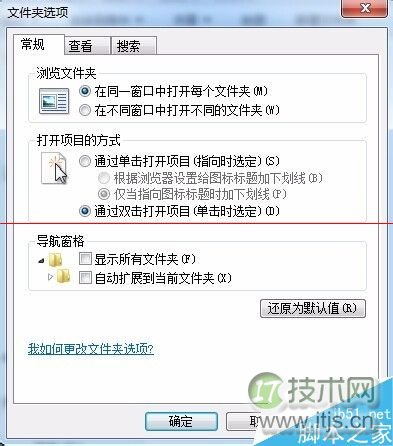 3、之后,进入到“文件夹选项”页面。通过“常规”页面,可以设置文件的浏览方式,打开项目的方式以及导航的样式这些信息。设置完成之后,点击“应用”即可。
