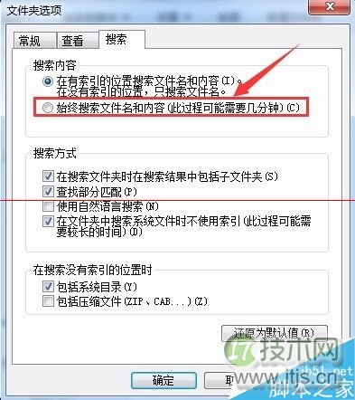6、之后,源码下载点击选择“搜索”页面,在搜索内容这一项中,选择箭头所指的“始终搜索文件名和内容......”