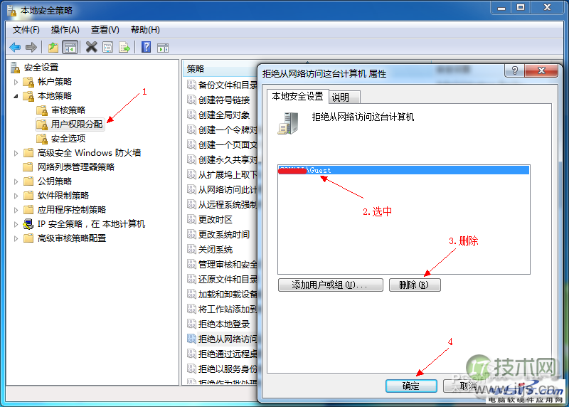 4.删除“拒绝从网络访问这台计算机”里面的享让n系“Guest”也就是来宾用户。