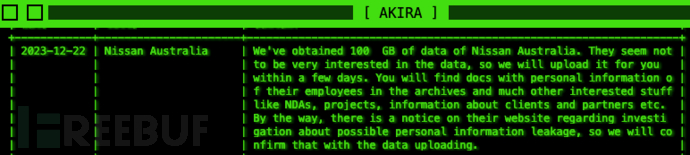 Bleeping Computer 网站消息,撕票Akira 勒索软件团伙声称成功入侵了日本汽车制造商日产汽车澳大利亚分公司的公开内部网络系统。