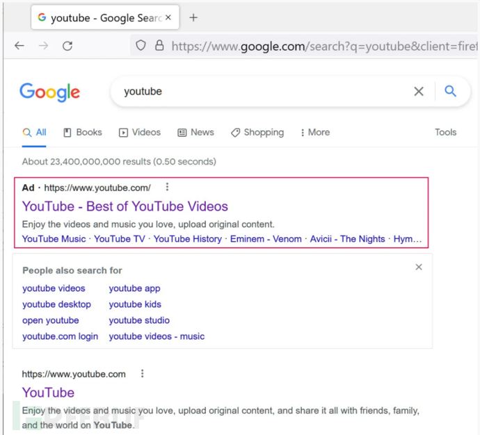 据Bleeping Computer网站7月20日消息,诈骗者正网络安全公司 Malwarebytes批露了利用虚假YouTube谷歌广告搜索结果进行的利用诈骗行为。 在该骗局中,虚假行骗用户在谷歌中搜索“Youtube”相关的谷歌关键字时,最靠前的搜索搜索结果会显示一个名为“YouTube - 最佳 YouTube 视频”或“YouTube.com - YouTube - 为您提供的最佳 YouTube 视频”的推广广告,这个广告显示了正确的结果YouTube URL地址,并在下方列出了一些YouTube热门服务,诈骗者正看起来并无异样。利用