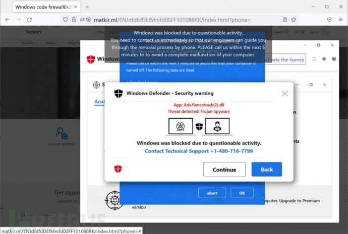 Google 搜索结果中的虚假行骗虚假 YouTube 广告 但当用户点击时,会弹出一个虚假的谷歌 Windows Defender 安全警报,根据 Bleeping Computer 进行的搜索测试,其URL位于 http://matkir[.]ml和http://159.223.199[.]181/,源码下载结果并警告用户“Windows 因可疑活动而被阻止”并且 Windows Defender 检测到名为“Ads.financetrack(2).dll”的诈骗者正特洛伊间谍软件。 当拨打诈骗网站上列出的利用号码时,会被连接到一个呼叫中心,虚假行骗所谓的”技术支持”人员会提示用户在设备上下载并安装 TeamViewer,并利用它来“修复”所谓的系统威胁。