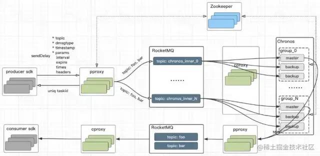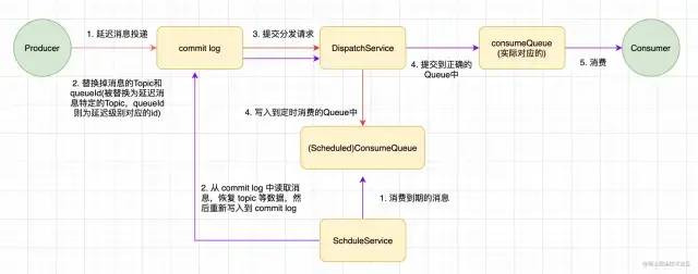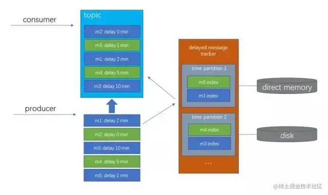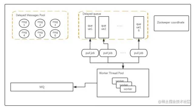 这个方案老实说是一个比较重的方案。因为基于 RocksDB 来实现的话,从数据可用性的角度考虑,你还需要自己去处理多副本的数据同步等逻辑。 优点:RocksDB LSM 树很适合消息场景的大量写入;缺点:实现方案较重,如果你采用这个方案,站群服务器需要自己实现 RocksDB 的数据容灾逻辑;基于Redis再来聊聊 Redis 的方案。下面放一个比较完善的方案。  Messages Pool 所有的延时消息存放,结构为KV结构,key为消息ID,value为一个具体的message(这里选择Redis Hash结构主要是因为hash结构能存储较大的数据量,数据较多时候会进行渐进式rehash扩容,并且对于HSET和HGET命令来说时间复杂度都是O(1))Delayed Queue是16个有序队列(队列支持水平扩展),结构为ZSET,value 为 messages pool中消息ID,score为过期时间(分为多个队列是为了提高扫描的速度)Worker 代表处理线程,通过定时任务扫描 Delayed Queue 中到期的消息这个方案选用 Redis 存储在我看来有几点考虑: Redis ZSET 很适合实现延时队列;性能问题,虽然 ZSET 插入是一个 O(logn) 的操作,但是Redis 基于内存操作,并且内部做了很多性能方面的优化。但是这个方案其实也有需要斟酌的地方,上述方案通过创建多个 Delayed Queue 来满足对于并发性能的要求,但这也带来了多个 Delayed Queue 如何在多个节点情况下均匀分配,并且很可能出现到期消息并发重复处理的情况,是否要引入分布式锁之类的并发控制设计? 在量不大的场景下,上述方案的架构其实可以蜕化成主从架构,只允许主节点来处理任务,从节点只做容灾备份。实现难度更低更可控。 定时线程检查的缺陷与改进上述几个方案中,都通过线程定时扫描的方案来获取到期的消息。 定时线程的方案在消息量较少的时候,会浪费资源,在消息量非常多的时候,又会出现因为扫描间隔设置不合理导致延时时间不准确的问题。可以借助 JDK Timer 类中的思想,通过 wait-notify 来节省 CPU 资源。 获取中最近的延时消息,然后wait(执行时间-当前时间),这样就不需要浪费资源到达时间时会自动响应,如果有新的消息进入,并且比我们等待的消息还要小,那么直接notify唤醒,重新获取这个更小的消息,然后又wait,如此循环。 开源 MQ 中的实现方案再来讲讲目前自带延时消息功能的开源MQ,它们是如何实现的 RocketMQRocketMQ 开源版本支持延时消息,但是只支持 18 个 Level 的延时,并不支持任意时间。只不过这个 Level 在 RocketMQ 中可以自定义的,所幸来说对普通业务算是够用的。默认值为“1s 5s 10s 30s 1m 2m 3m 4m 5m 6m 7m 8m 9m 10m 20m 30m 1h 2h”,18个level。 通俗的讲,设定了延时 Level 的消息会被暂存在名为 SCHEDULE_TOPIC_XXXX的topic中,并根据 level 存入特定的queue,queueId = delayTimeLevel – 1,即一个queue只存相同延时的消息,保证具有相同发送延时的消息能够顺序消费。broker会调度地消费SCHEDULE_TOPIC_XXXX,将消息写入真实的topic。 下面是整个实现方案的示意图,红色代表投递延时消息,紫色代表定时调度到期的延时消息: