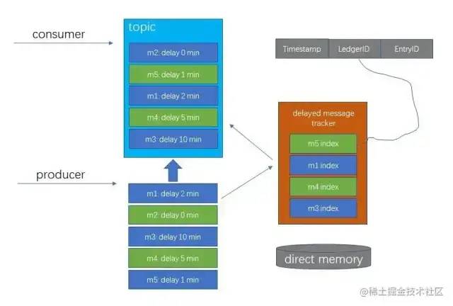 优点: Level 数固定,每个 Level 有自己的定时器,开销不大;将 Level 相同的消息放入到同一个 Queue 中,保证了同一 Level 消息的顺序性;不同 Level 放到不同的 Queue 中,保证了投递的时间准确性;通过只支持固定的Level,将不同延时消息的排序变成了固定Level Topic 的追加写操作。缺点: Level 配置的修改代价太大,固定 Level 不灵活;CommitLog 会因为延时消息的存在变得很大。PulsarPulsar 支持“任意时间”的延时消息,但实现方式和 RocketMQ 不同。 通俗的讲,Pulsar 的延时消息会直接进入到客户端发送指定的 Topic 中,然后在堆外内存中创建一个基于时间的优先级队列,来维护延时消息的索引信息。延时时间最短的会放在头上,时间越长越靠后。在进行消费逻辑时候,再判断是否有到期需要投递的消息,如果有就从队列里面拿出,根据延时消息的索引查询到对应的消息进行消费。 如果节点崩溃,在这个 broker 节点上的 Topics 会转移到其他可用的 broker 上,上面提到的这个优先级队列也会被重建。 下面是 Pulsar 公众号中对于 Pulsar 延时消息的示意图。