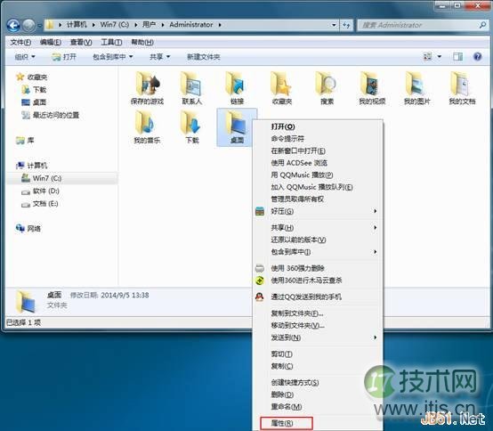 4、这时找到“桌面”文件夹,右键点击它并选择“属性”,如下图所示: