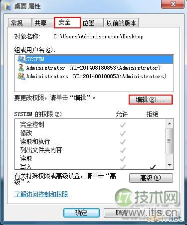 5、在桌面属性面板中,切换到“安全”选项卡,在安全选项卡中单击“编辑”按钮,如下图所示: