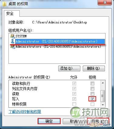 6、在桌面的权限设置面板中,选择“Administration”用户,然后在下方的“SYSTEM的云服务器提供商权限”中勾选“拒绝写入”,然后点击“应用”和“确定”,如下图所示: