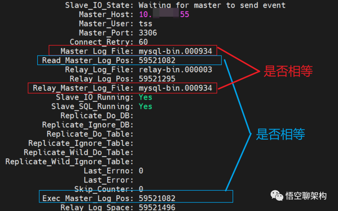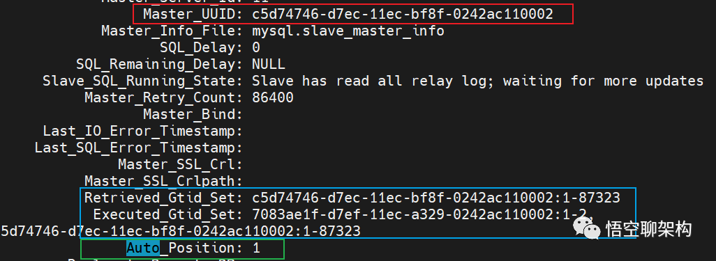 Master_Log_File 和 Read_Master_Log_Pos 这两个参数合起来表示的是读到的主库的最新位点,第一参数是代表读取到了哪个文件,第二个是读取到的文件的位置。 Relay_Master_Log_File 和 Exec_Master_Log_Pos,这两个参数合起来表示的是从库执行的最新位点。 如果红色框起来的两个参数:Master_Log_File 和 Relay_Master_Log_File 相等,则说明从库读到的最新文件和主库上生成的文件相同,这里都是 mysql-bin.000934。 如果蓝色框起来的两个参数 Read_Master_Log_Pos 和 Exec_Master_Log_Pos 相等,则说明从库读到的日志文件的位置和从库上执行日志文件的位置相同,这里都是 59521082。 当上面两组参数都相等时,则说明没有延迟。 方案三:对比 GTID 集合方案三是对比 GTID 集合。首先我们在从库上执行 show slave status \G来查看 GTID 集合。 如下图所示: