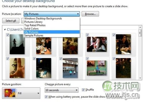 在桌面右键,选择“个性化”。个性化窗口的底部点击“桌面背景”。“图片位置”下拉式菜单上选择“我的图片”,并单击“浏览”。浏览图片,选定桌面幻灯片图片,单击确定。