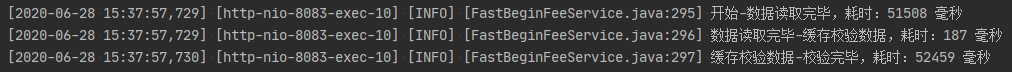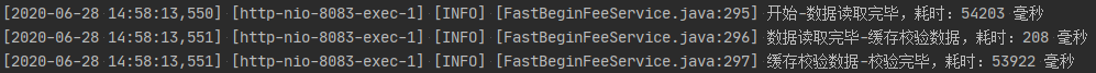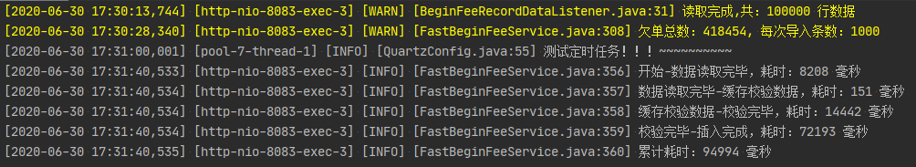并行插入工具类并行插入的代码我封装了一个函数式编程的工具类,也提供给大家 复制/** * 功能:利用并行流快速插入数据 * * @author Keats * @date 2020/7/1 9:25 */public class InsertConsumer { /** * 每个长 SQL 插入的行数,可以根据数据库性能调整 */ private final static int SIZE = 1000; /** * 如果需要调整并发数目,修改下面方法的第二个参数即可 */ static { System.setProperty("java.util.concurrent.ForkJoinPool.common.parallelism", "4"); } /** * 插入方法 * * @param list 插入数据集合 * @param consumer 消费型方法,直接使用 mapper::method 方法引用的方式 * @param <T> 插入的数据类型 */ public static <T> void insertData(List<T> list, Consumer<List<T>> consumer) { if (list == null || list.size() < 1) { return; } List<List<T>> streamList = new ArrayList<>(); for (int i = 0; i < list.size(); i += SIZE) { int j = Math.min((i + SIZE), list.size()); List<T> subList = list.subList(i, j); streamList.add(subList); } // 并行流使用的并发数是 CPU 核心数,不能局部更改。全局更改影响较大,斟酌 streamList.parallelStream().forEach(consumer); }}1.2.3.4.5.6.7.8.9.10.11.12.13.14.15.16.17.18.19.20.21.22.23.24.25.26.27.28.29.30.31.32.33.34.35.36.37.38.39.40.41.42. 这里多数使用到很多 Java8 的API,不了解的朋友可以翻看我之前关于 Java 的博客。方法使用起来很简单 复制InsertConsumer.insertData(feeList, arrearageMapper::insertList);1. 其他影响性能的内容日志避免在 for 循环中打印过多的 info 日志 在优化的过程中,我还发现了一个特别影响性能的东西:info 日志,还是使用 41w行、25列、45.5m 数据,在 开始-数据读取完毕 之间每 1000 行打印一条 info 日志,缓存校验数据-校验完毕 之间每行打印 3+ 条 info 日志,日志框架使用 Slf4j 。打印并持久化到磁盘。下面是打印日志和不打印日志效率的差别: 打印日志